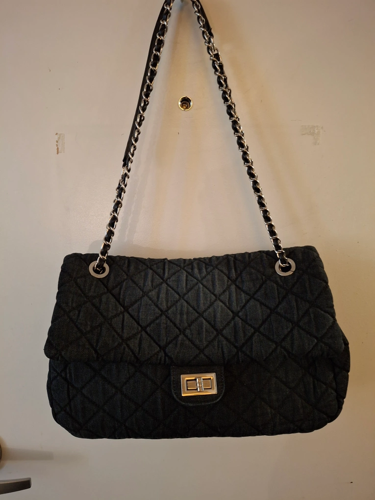 Dark wash denim quilted shoulder bag. Features a flap closure and chain strap. Excellent condition.