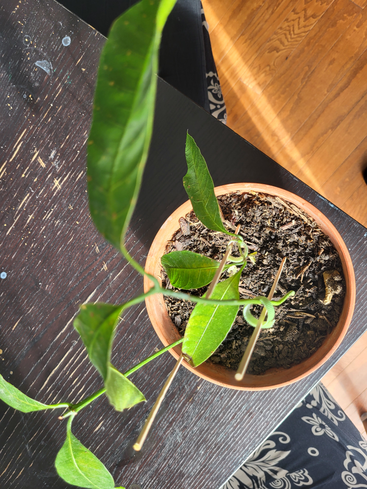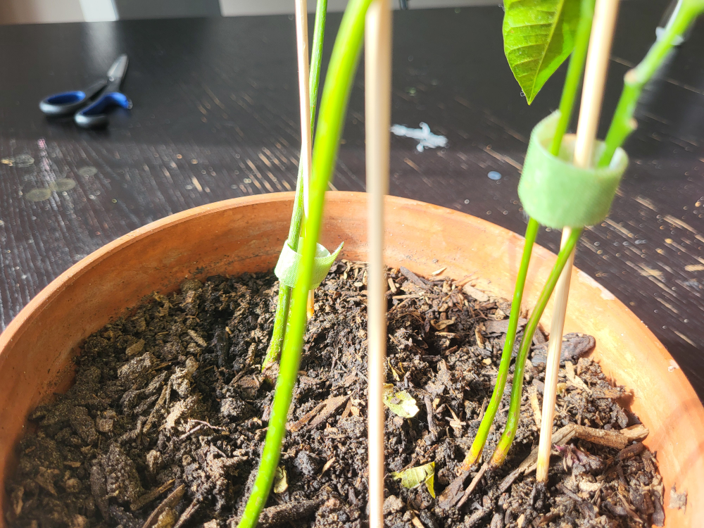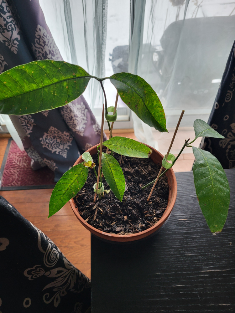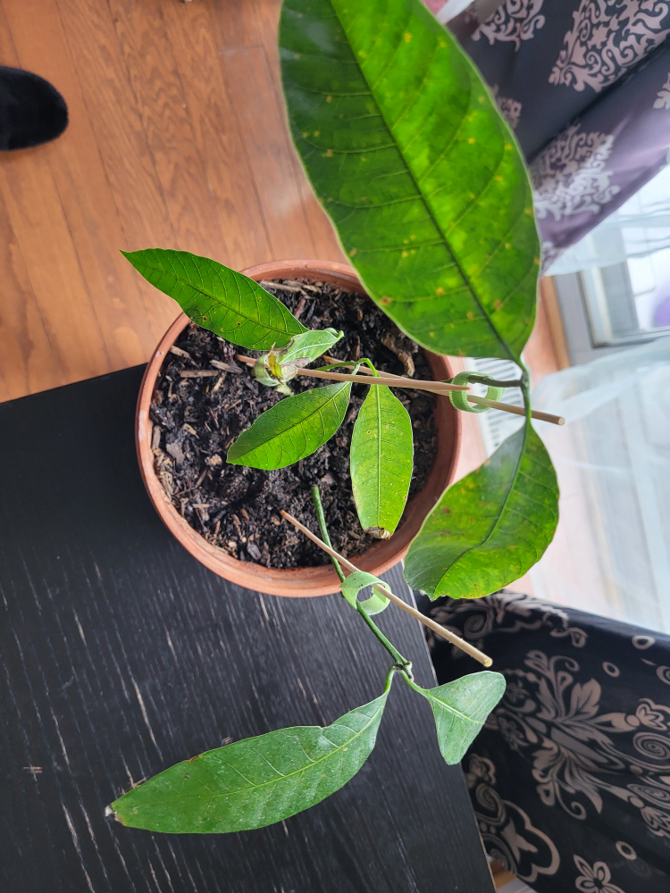 Small potted mango plant. Multiple stems supported by bamboo skewers. Healthy-looking leaves. Planted in terracotta pot. Some minor leaf discoloration.
