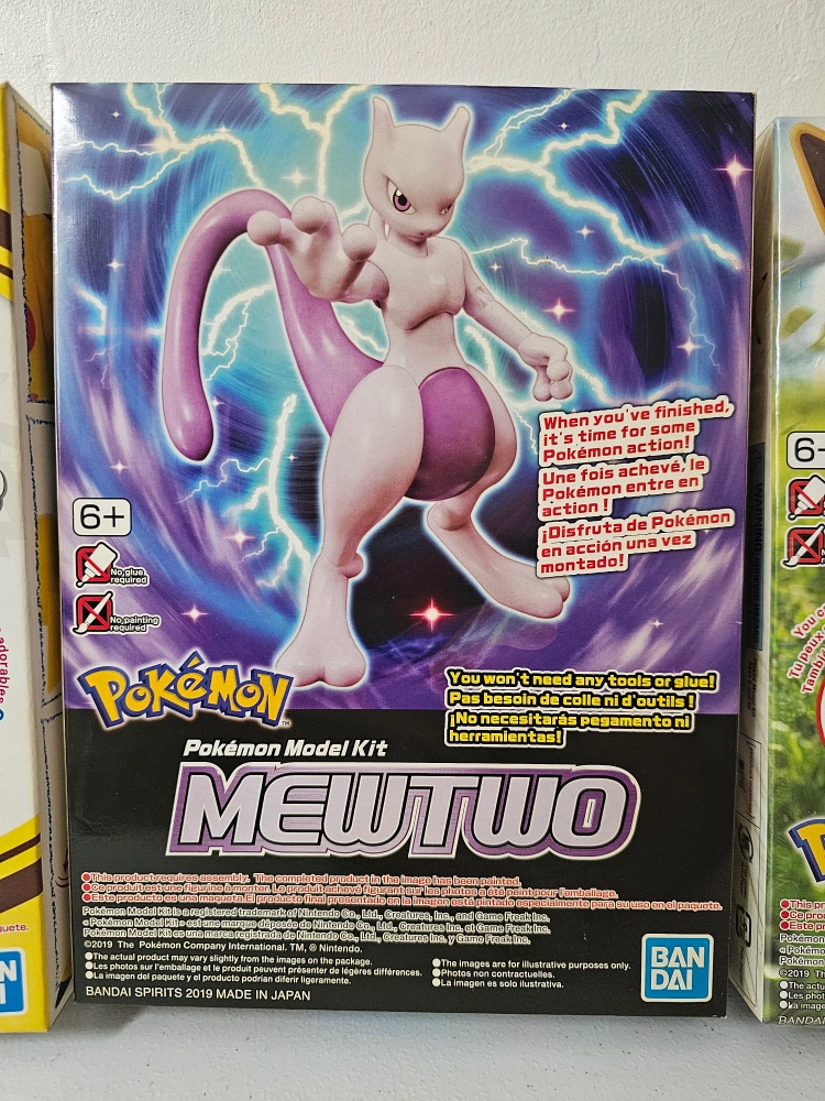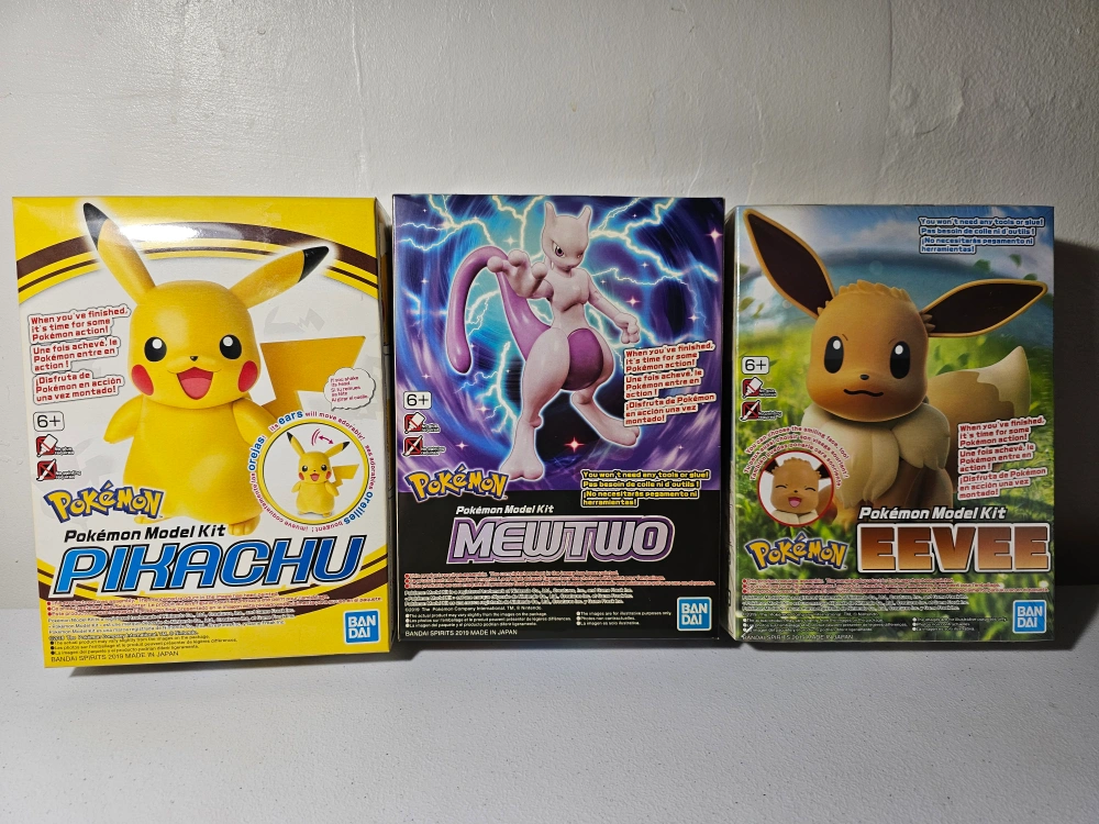 Three unopened Pokemon model kits. Pikachu, Mewtwo, and Eevee. Ages 6+. No tools or glue required. Made in Japan.