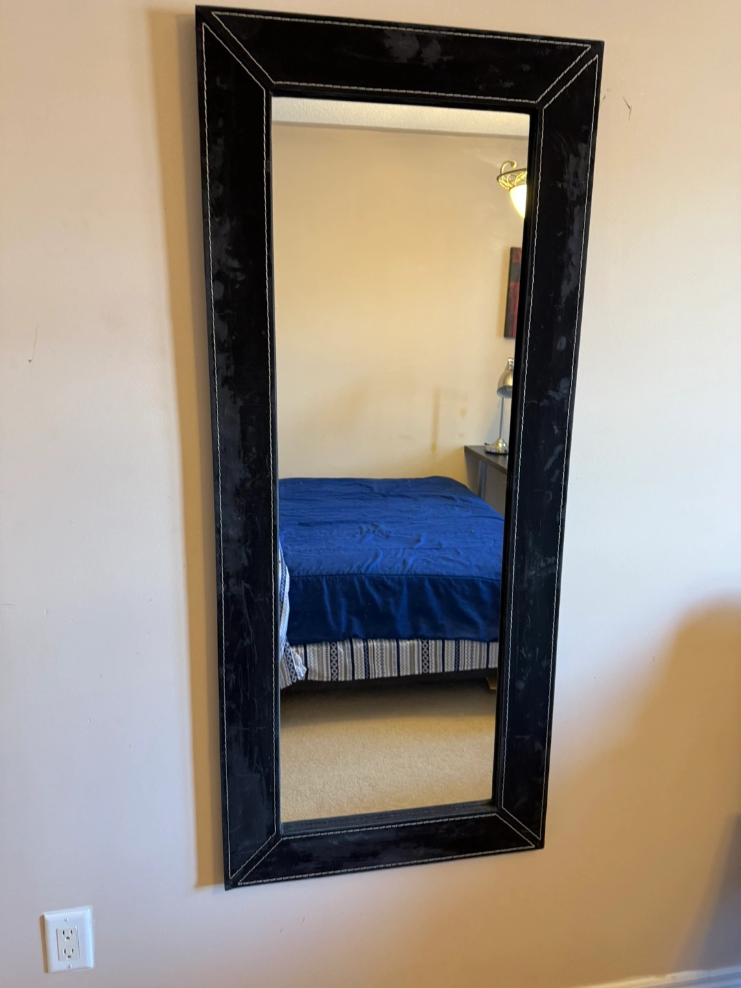 Large rectangular mirror. Black frame with off-white stitching detail and suede fabric. Wall-mounted. Great for bedrooms or entryways.