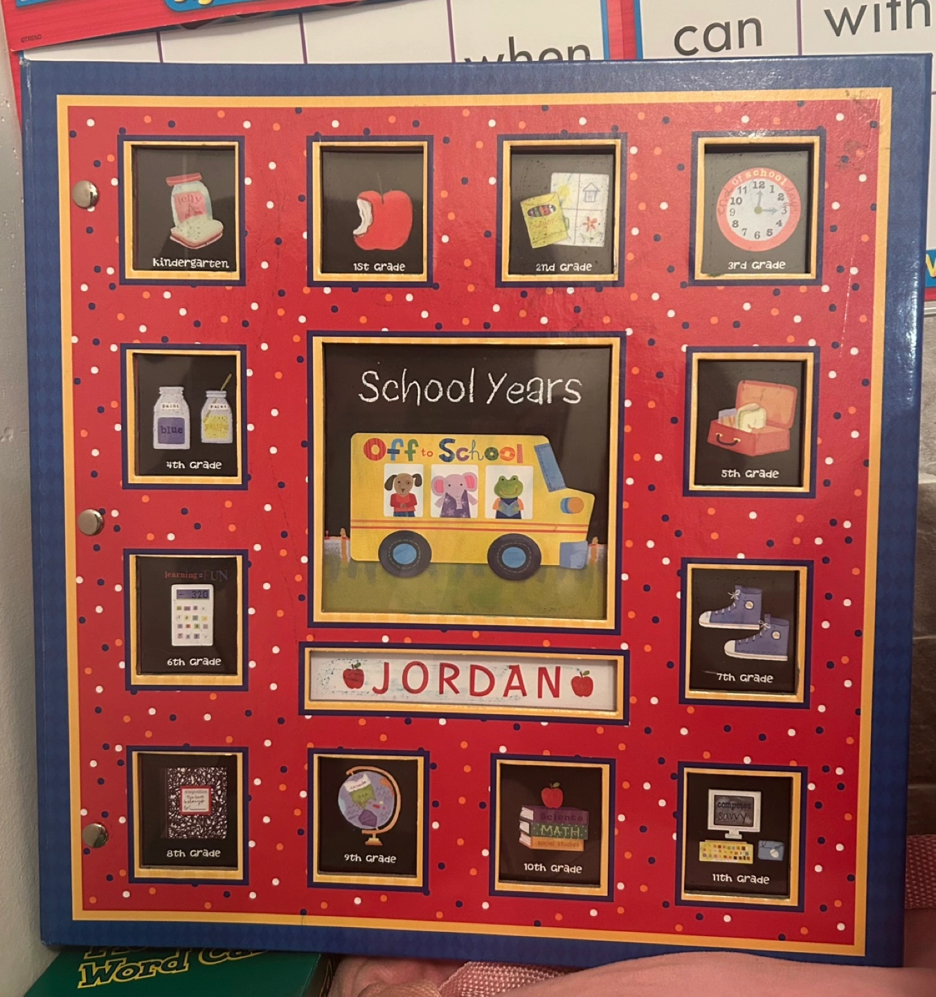 Eleven-page photo album. Each page represents a school year. Red cover with illustrations. Personalized name plate.