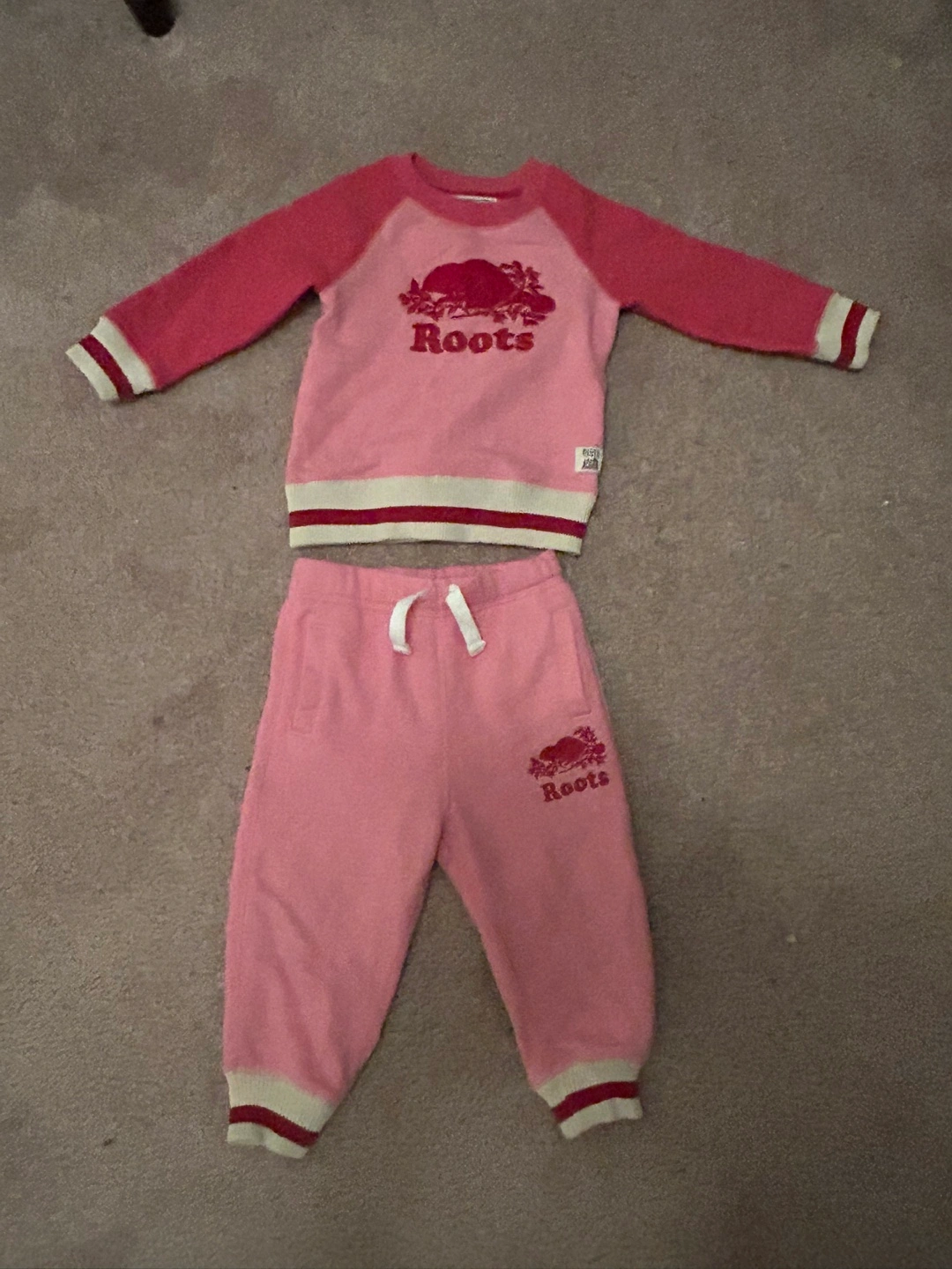Adorable baby girl's two-piece sweatsuit. Pink sweater and matching pants. Brand: Roots logo.