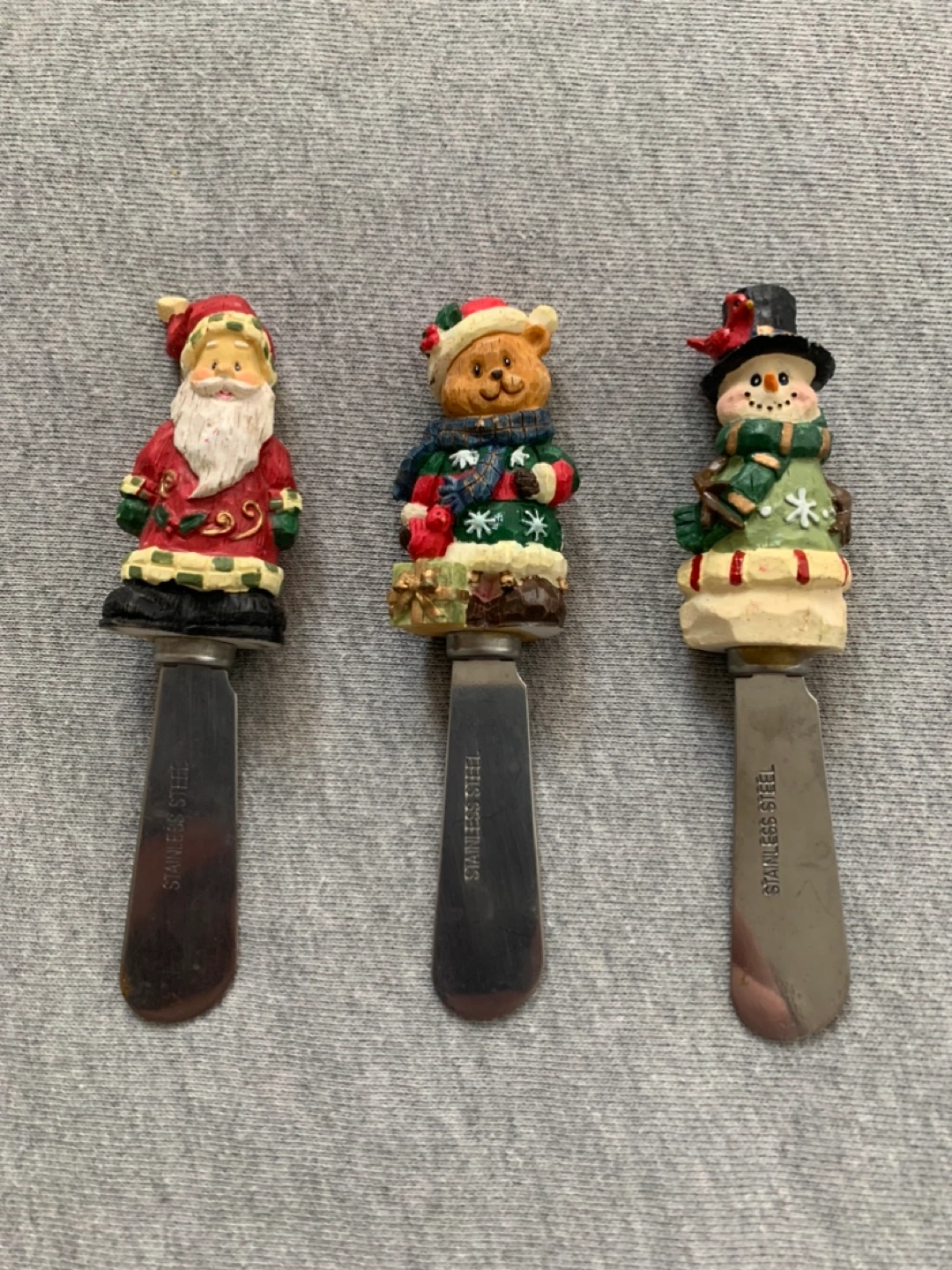 Three festive cheese spreaders. Features Santa, a bear, and a snowman. Stainless steel blades. Festive holiday decor.