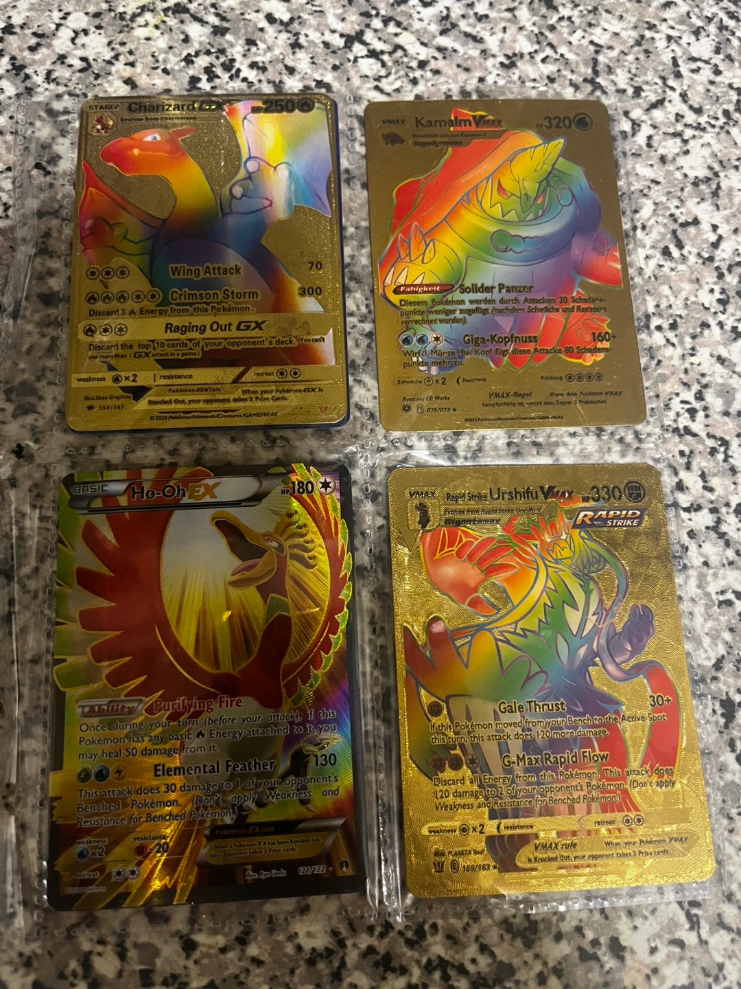 Collection of Pokemon cards. Includes gold cards and various other cards. Great for collectors or players.