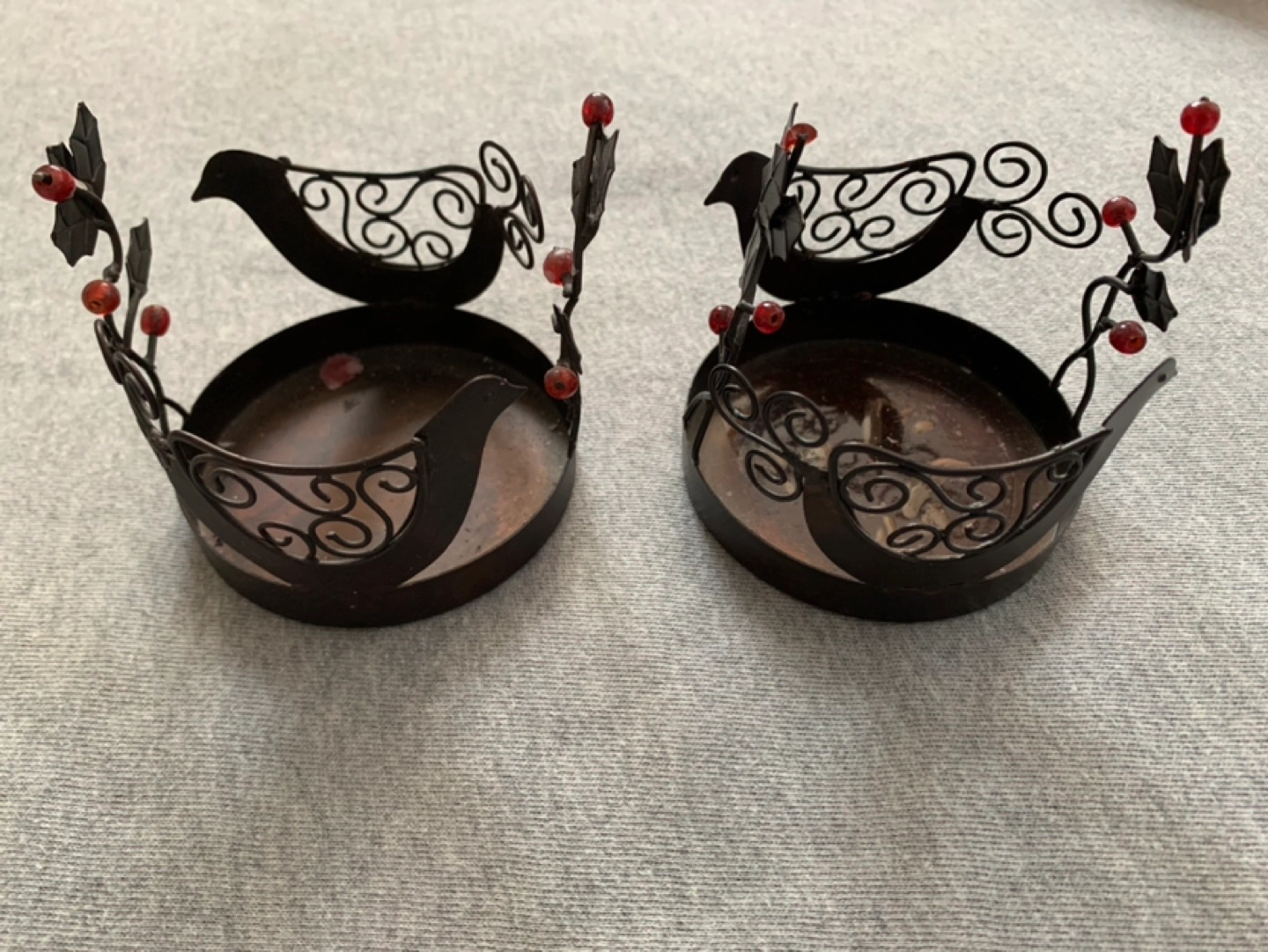 Set of two metal candle holders. Features birds (maybe partridges?) and holly berries. Dark brown/black finish.