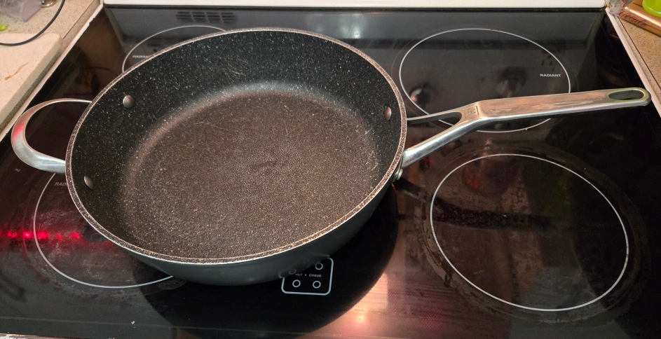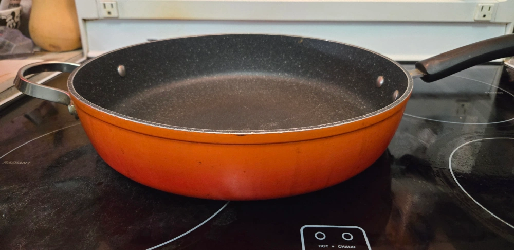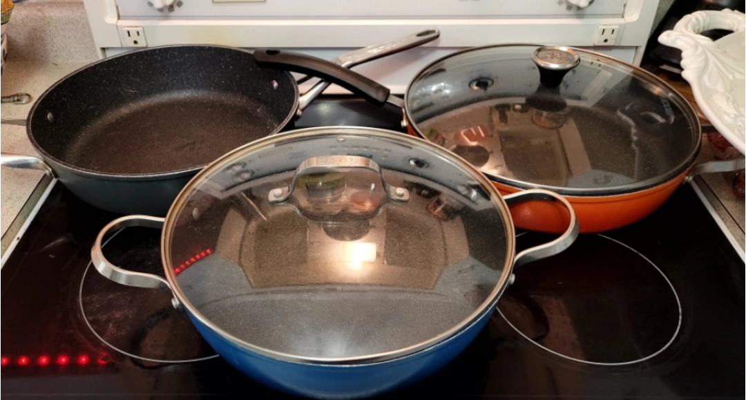 Three-piece cookware set. Includes a pan with two handles and a glass lid. Also, an orange pan with one handle. Suitable for various stovetops. Pre-owned, shows minor signs of use. the Grey one has no lid. it's great in the oven for all kinds of meat. sorry to part with them but my children are grown and left home now. no more cooking up a storm lol