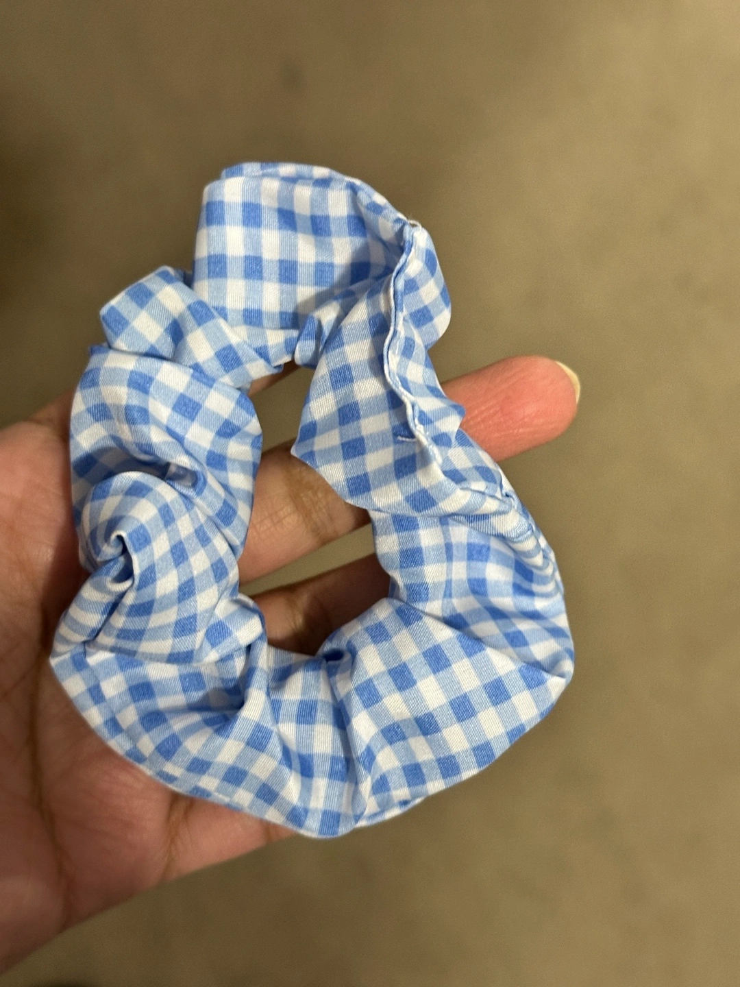 Cute blue and white gingham scrunchie. Soft fabric. Perfect for adding a pop of colour to your hair.