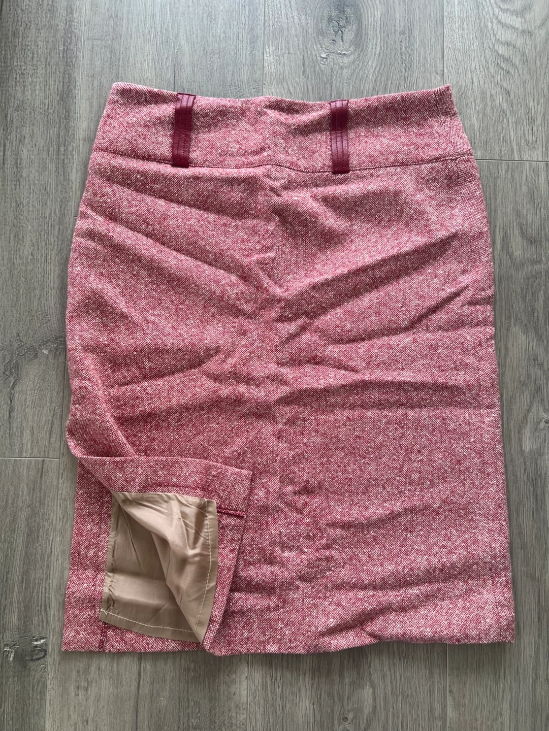 Red tweed pencil skirt. Size small. Features a side slit and leather-look accents at the waist. Made in Italy. ๐ฎ๐น