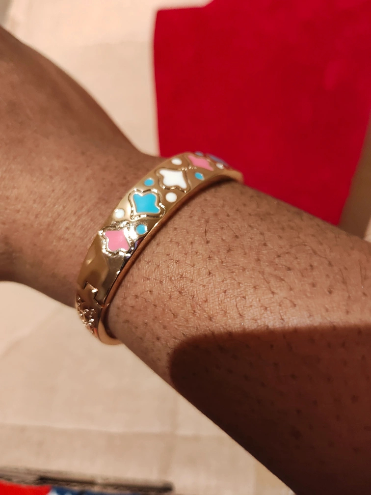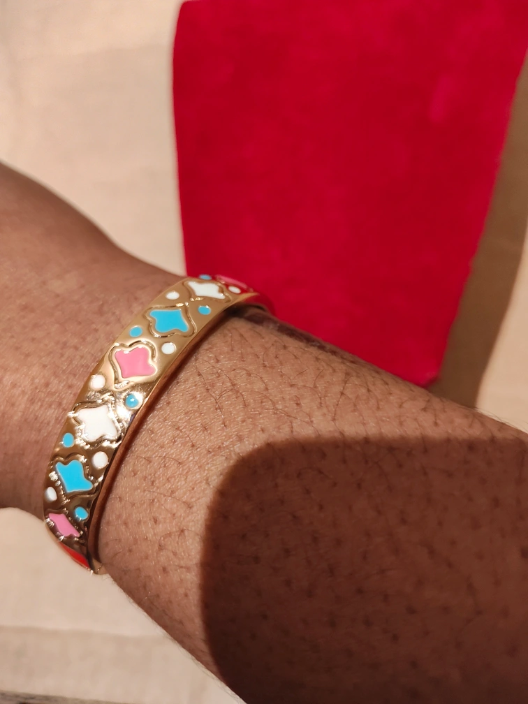 Beautiful gold-tone hinged bangle bracelet. Features colourful enamel detailing. Elegant and stylish. Perfect for everyday wear or special occasions.
