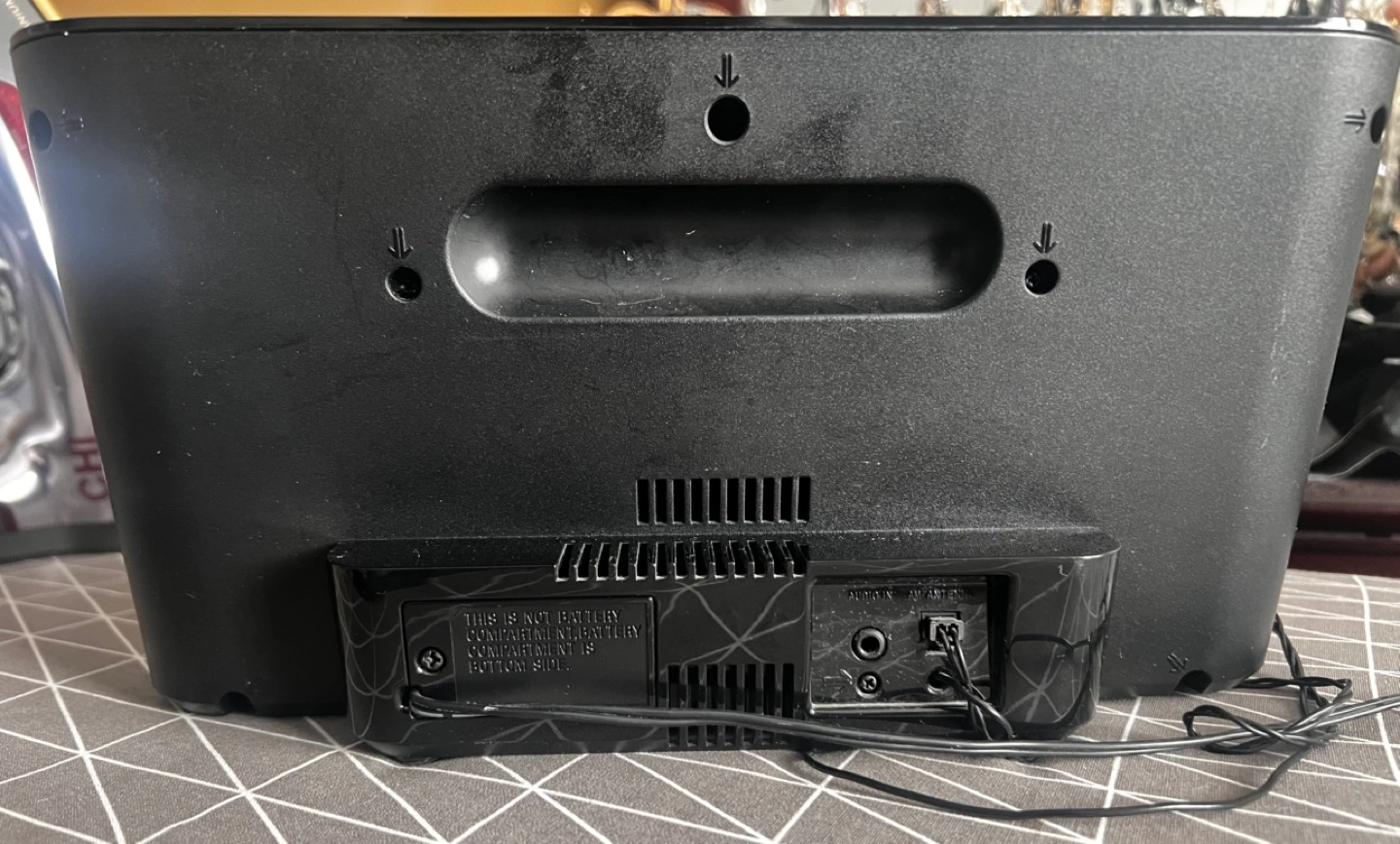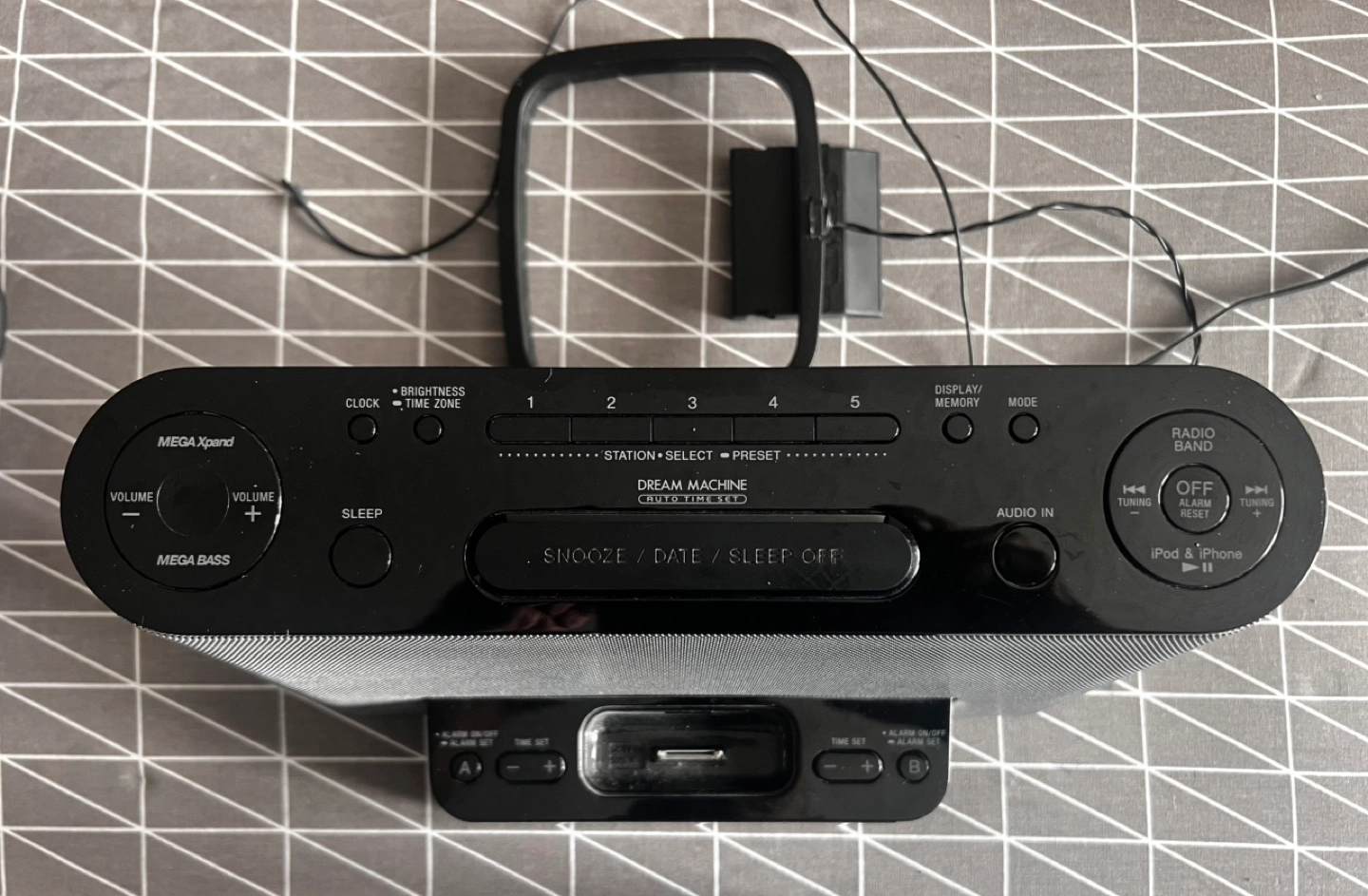 Sony clock radio with iPod/iPhone dock. Features FM/AM radio, alarm functions, and sleep timer. Includes antenna and power cord. Great for bedside table.