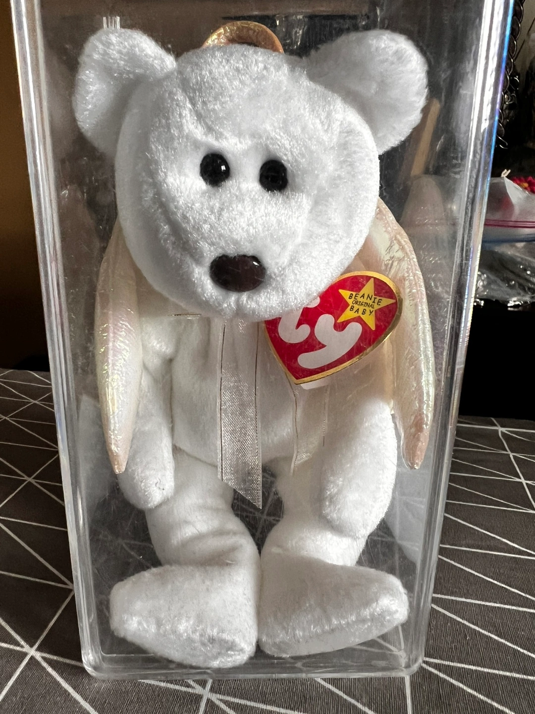 Collectible Beanie Baby angel bear. White fur, iridescent wings. Gold halo. Rare Brown Nose. Comes in a protective display case. Excellent condition.