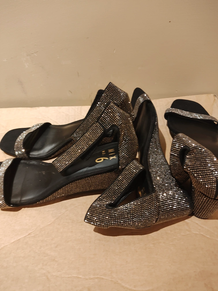 Mix No.6 Black Wedge Sandals with Rhinestones