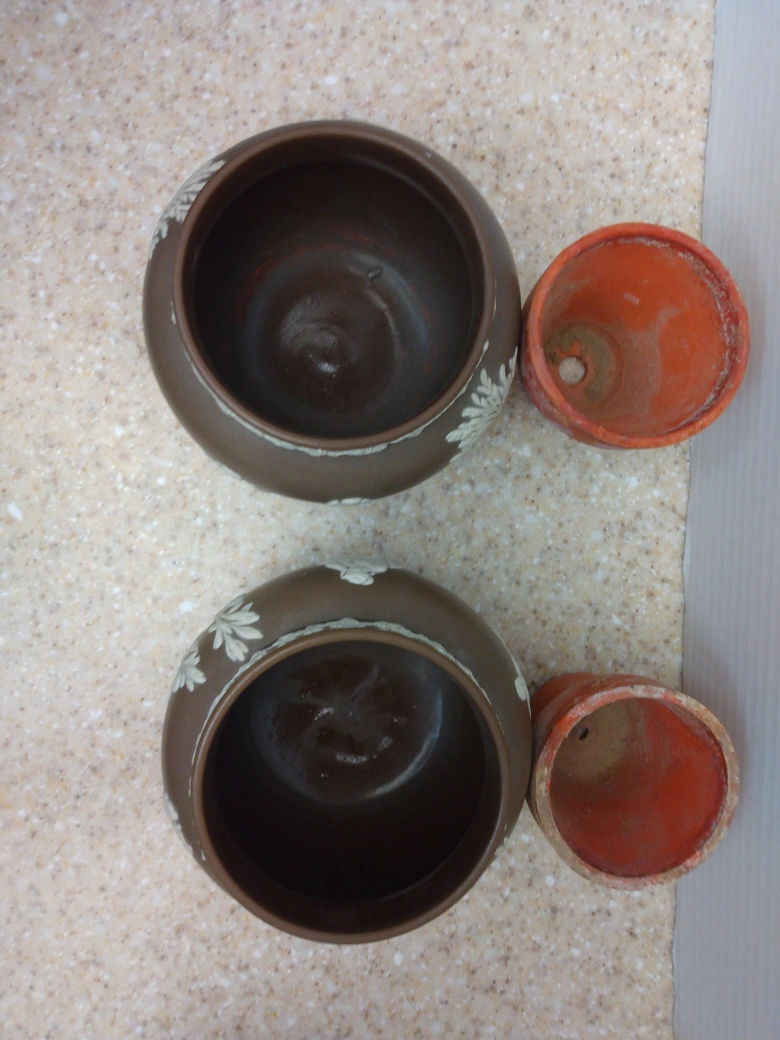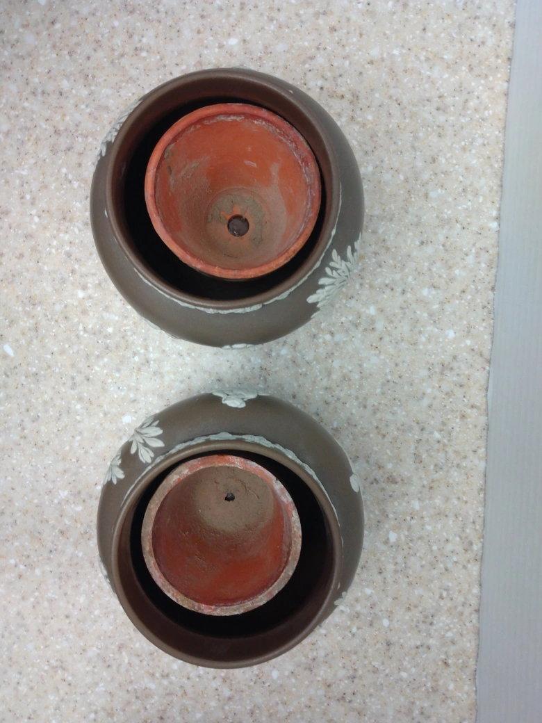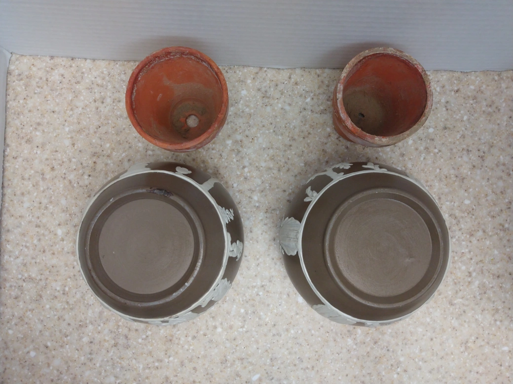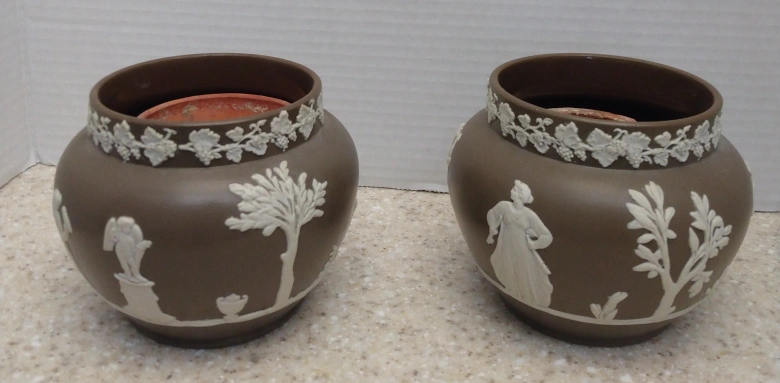 93Vintage Brown Jasperware planters. Planters are James Dudson pottery not Wedgewood but are the same style (Jasperware). Measures approximately 5 inches tall with a base of 4 inches in diameter. No chips or cracks. Price is for both. Pick up in Mississauga or downtown Toronto (Union Station).