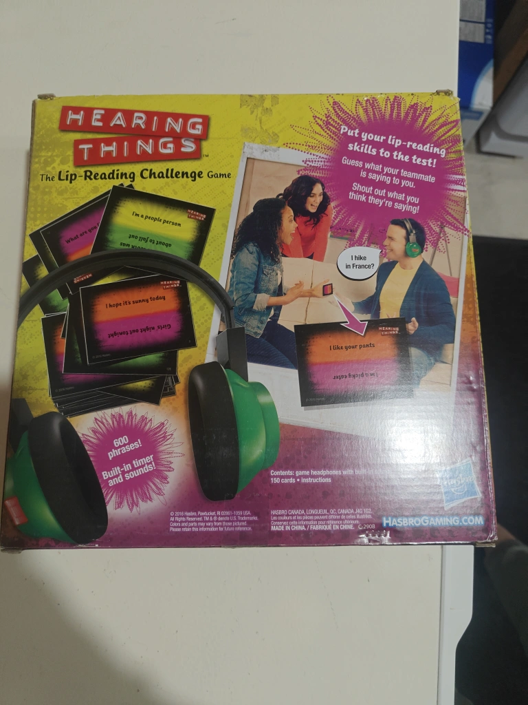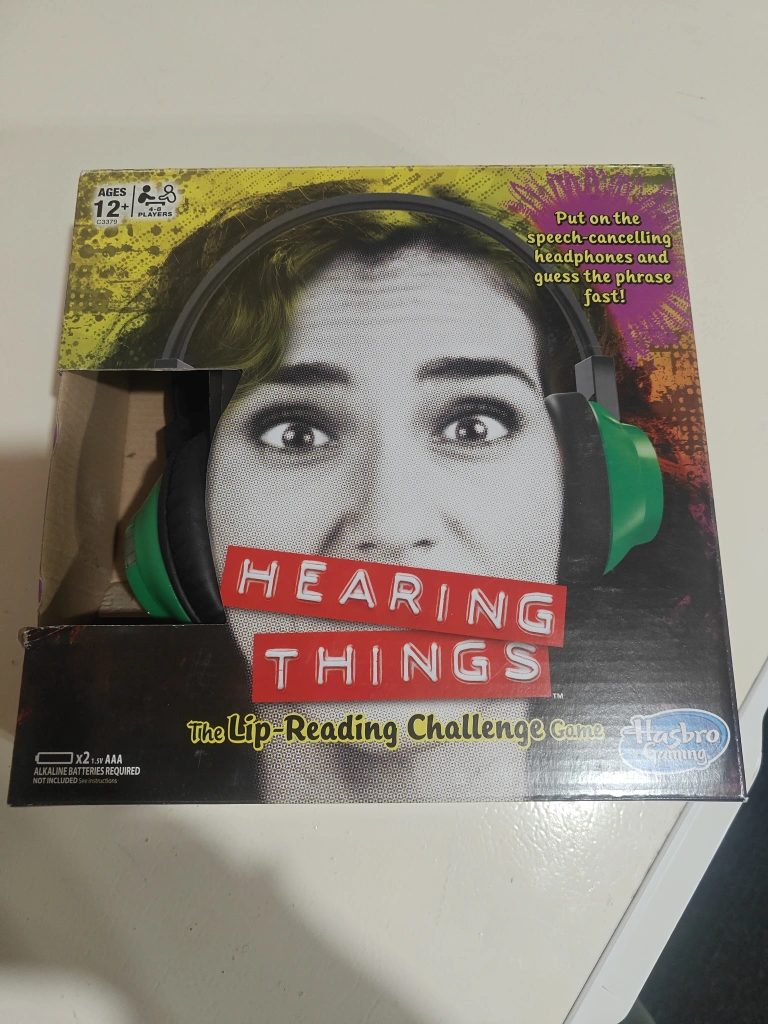 Fun party game. Includes headphones and game pieces. Ages 12+. For 2 or more players. 600 phrases, built-in timer and sounds.