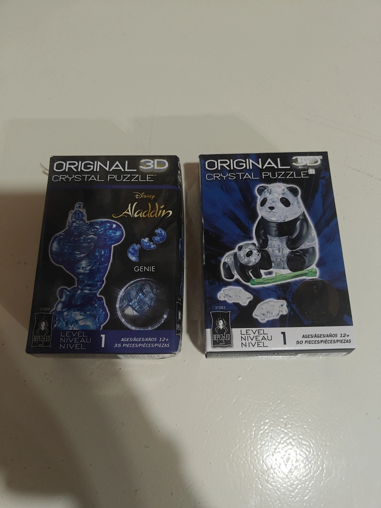 Two 50-piece Original 3D Crystal Puzzles. One features Aladdin's Genie, the other a panda. Level 1 difficulty. Ages 12+. Collect all! 5.00 each