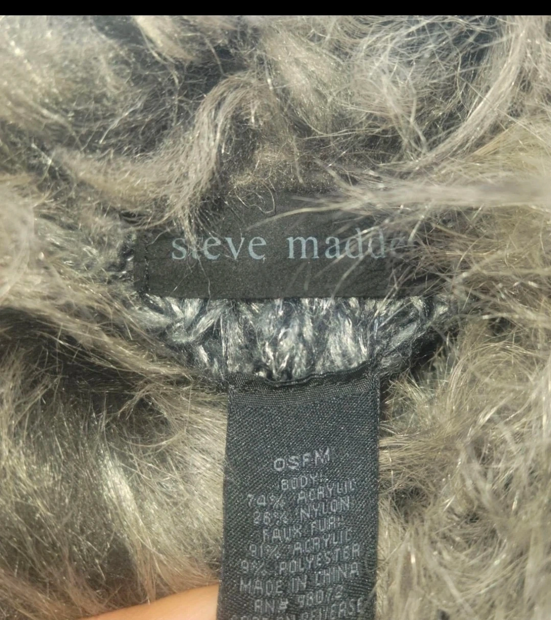 This cozy Steve Madden poncho features a faux fur collar and a textured knit design. It's a one-size-fits-most item with two front pockets. Body made of acrylic, nylon blend; faux fur is acrylic and polyester.