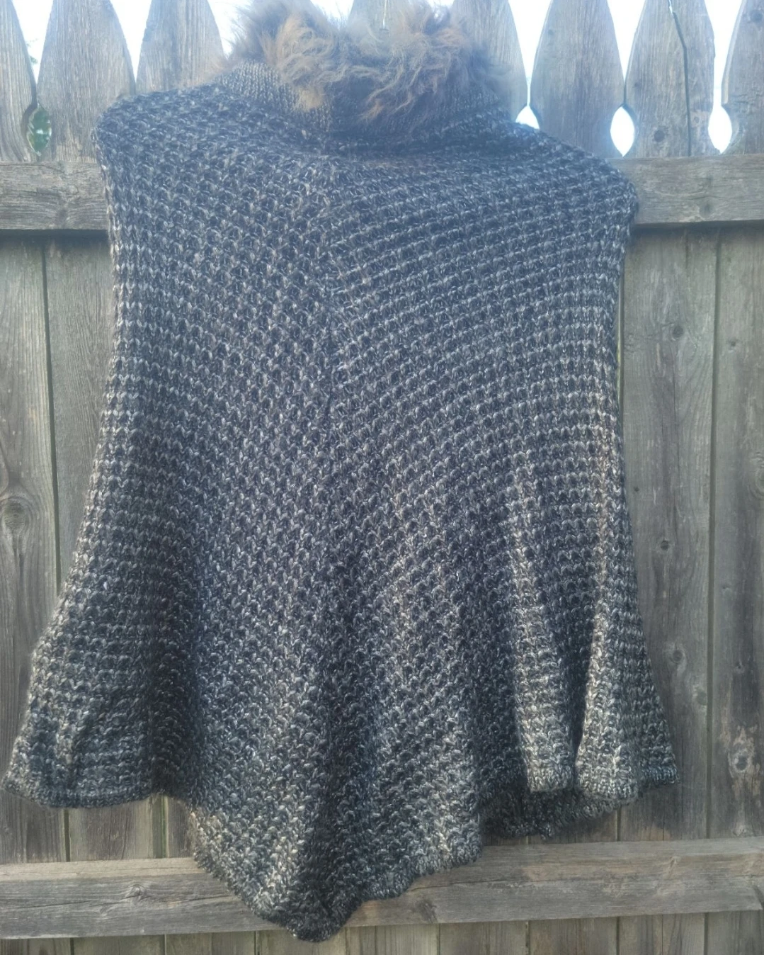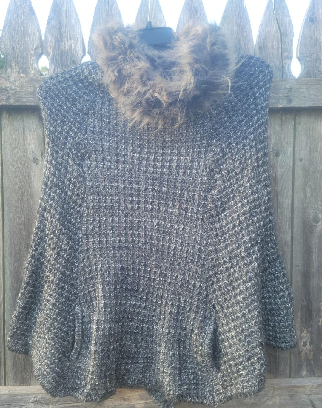 This cozy Steve Madden poncho features a faux fur collar and a textured knit design. It's a one-size-fits-most item with two front pockets. Body made of acrylic, nylon blend; faux fur is acrylic and polyester.