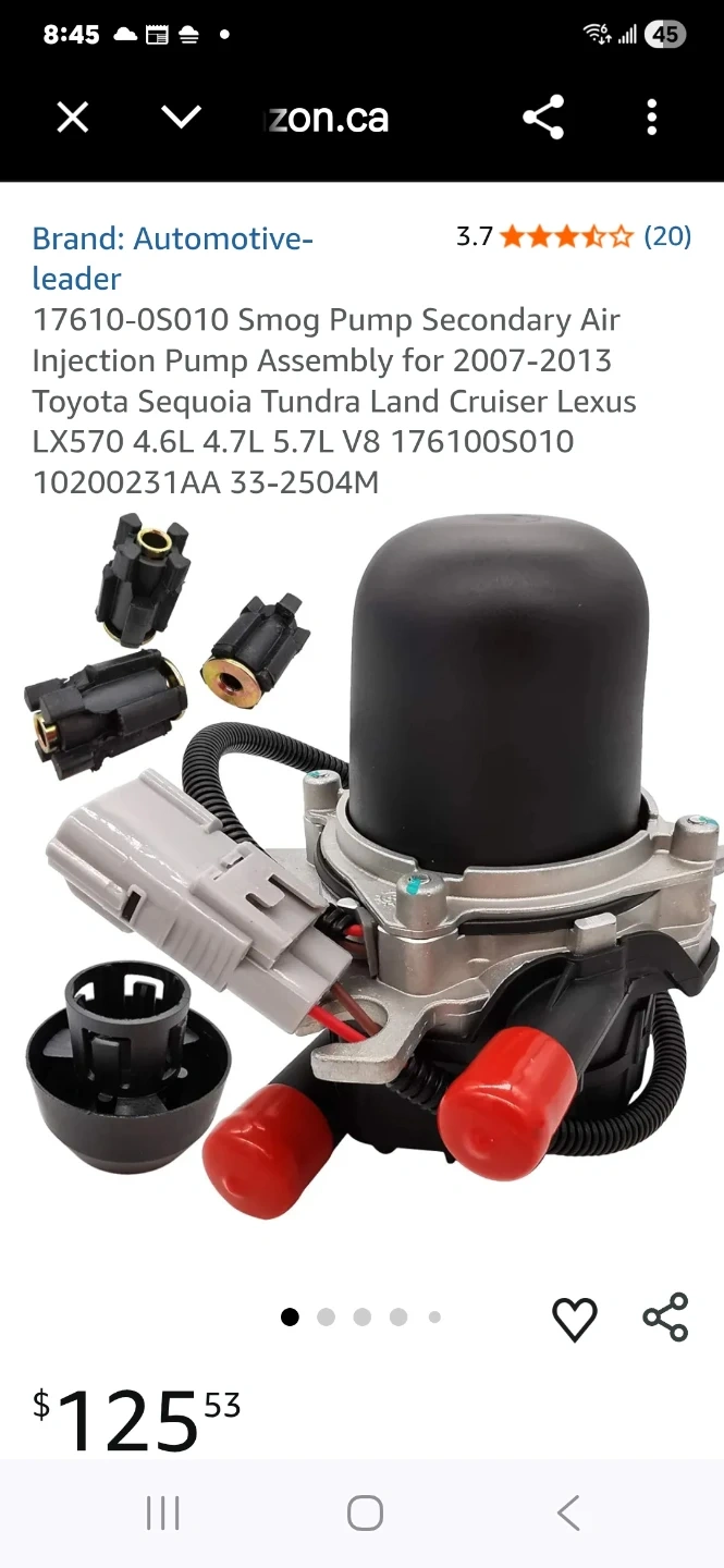 This is a Secondary Air Injection Pump Assembly, also known as a smog pump. It's designed to reduce exhaust emissions by injecting air into the exhaust system. Compatibility includes 2007-2013 Toyota Sequoia, Tundra, Land Cruiser, and Lexus LX570 models.
