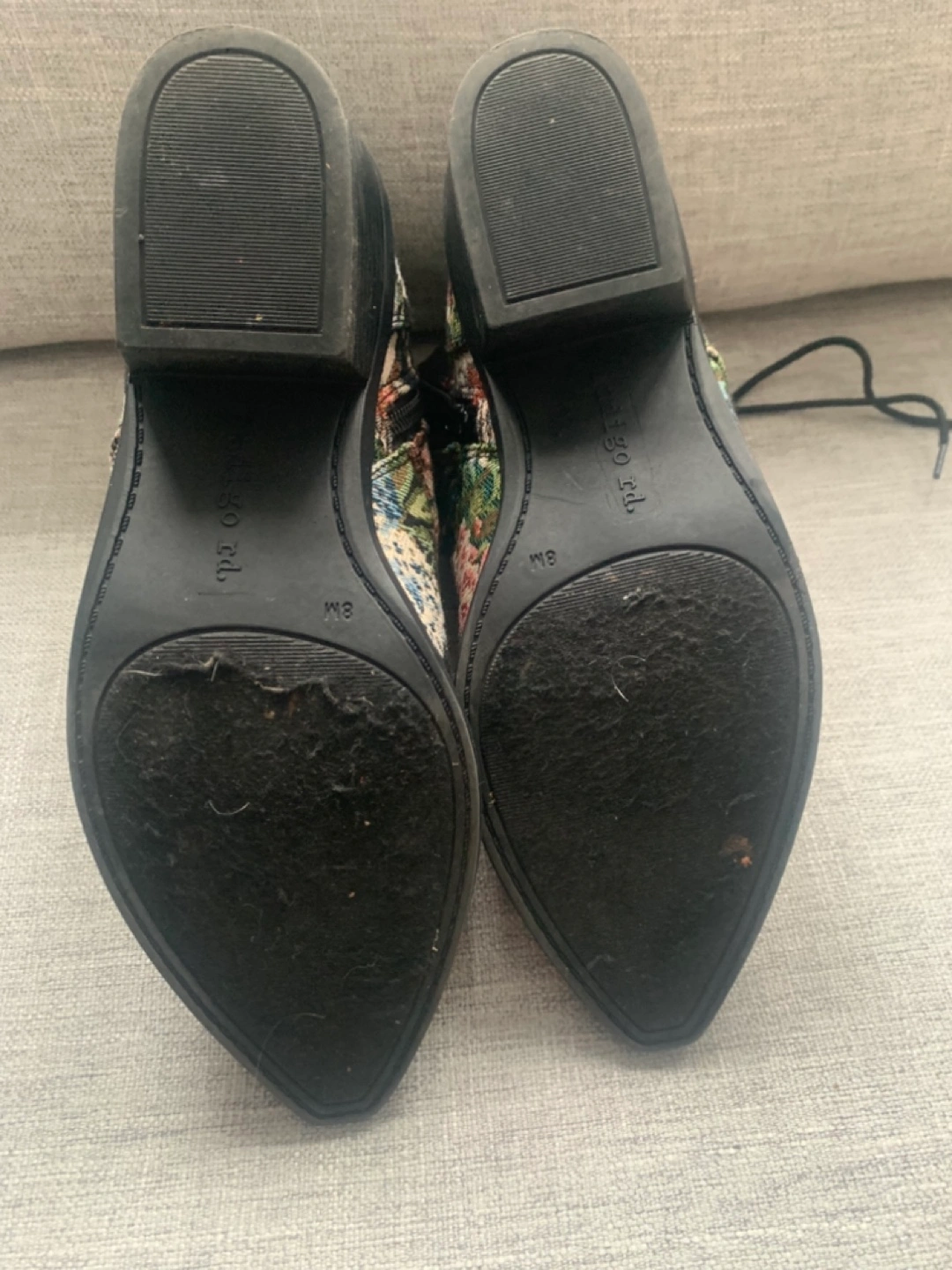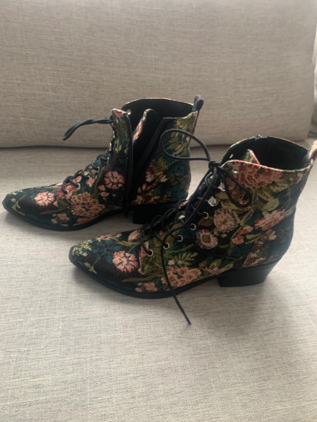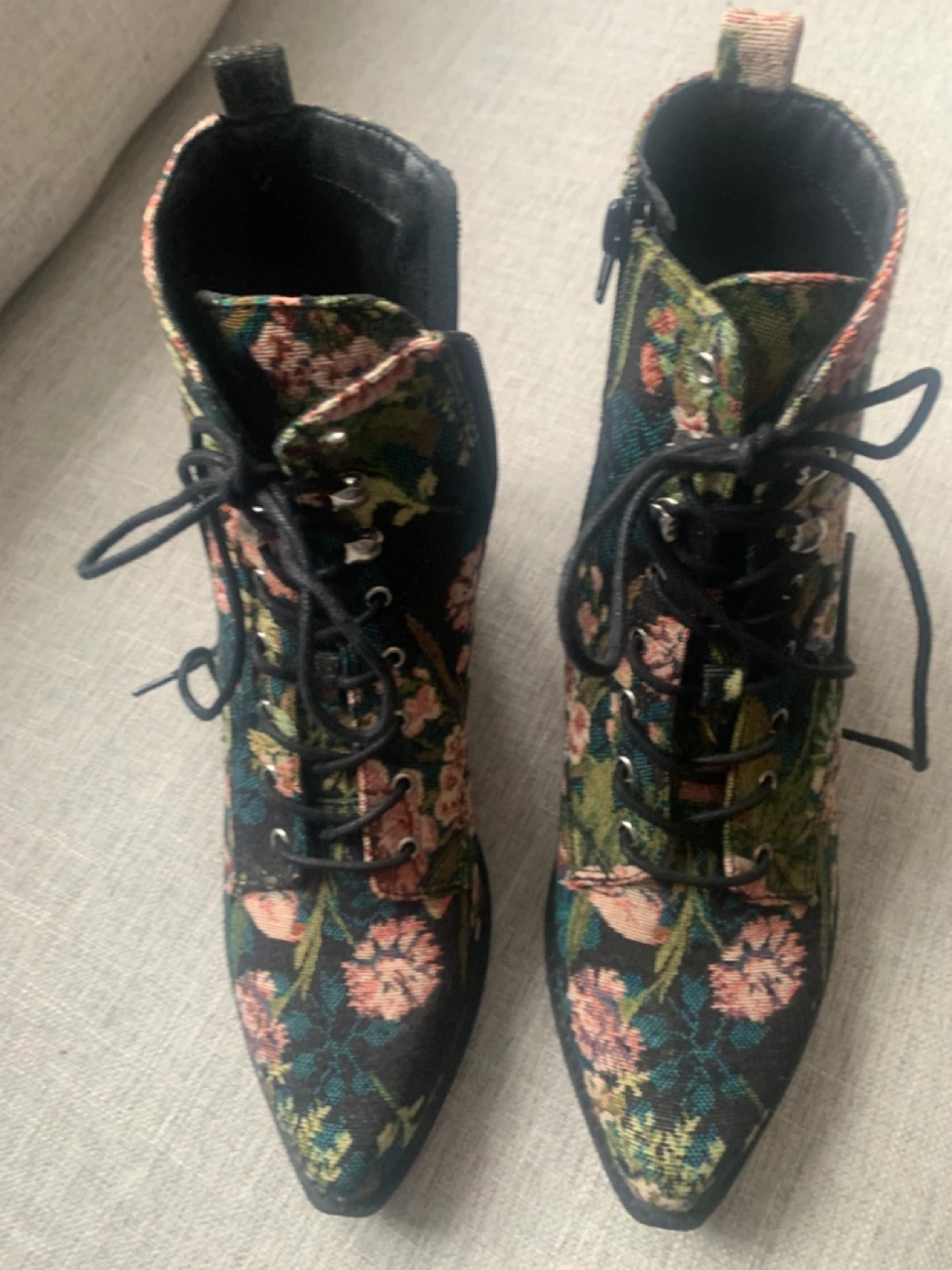 Women's ankle boots. Floral tapestry fabric. Lace-up closure. Side zipper. Pointed toe. Low block heel. Size 8M. Worn only a few times