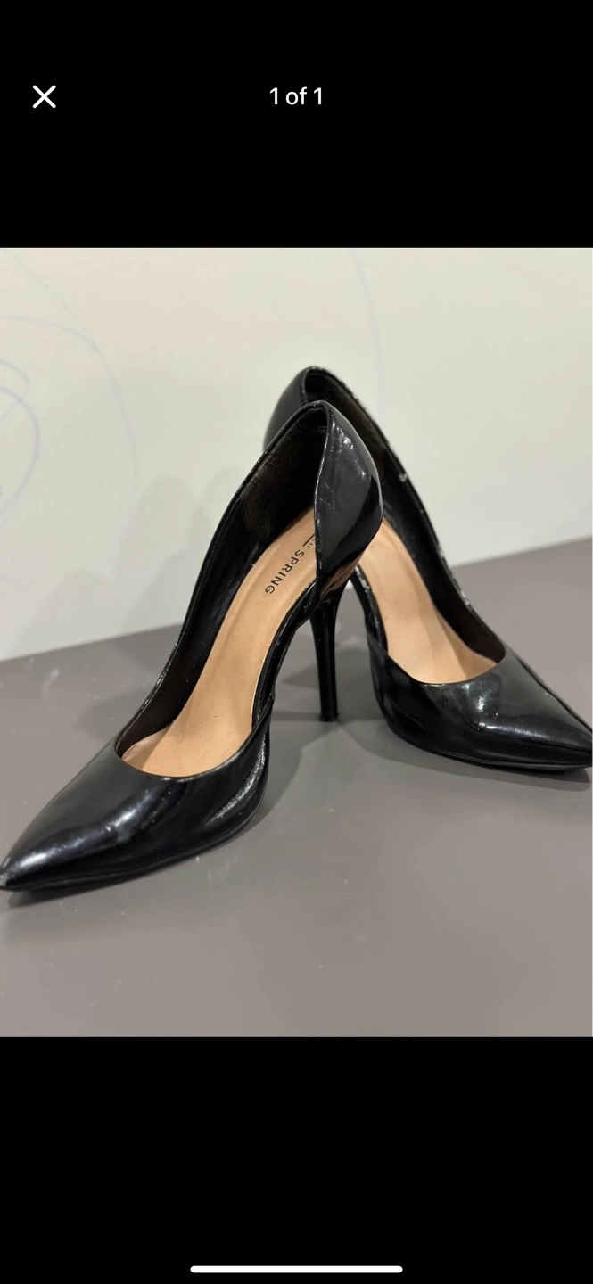 Pair of black patent leather high heels. Pointed toe. Cut-out detail on the side. High stiletto heel.