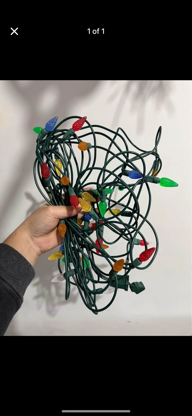 String of colourful Christmas lights. Green wire. Bulbs are various colours including red, green, blue, yellow and orange. Pre-owned.