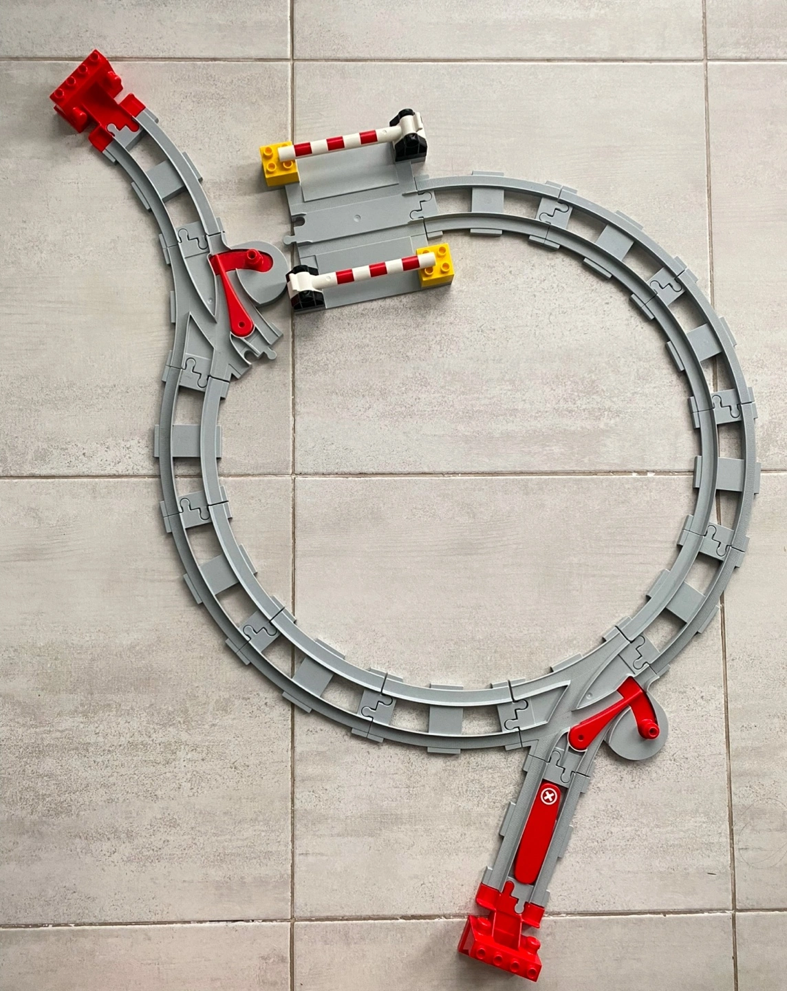 LEGO train track. Includes curved track pieces, two switches, and crossing gates. Great for expanding your LEGO train collection.
