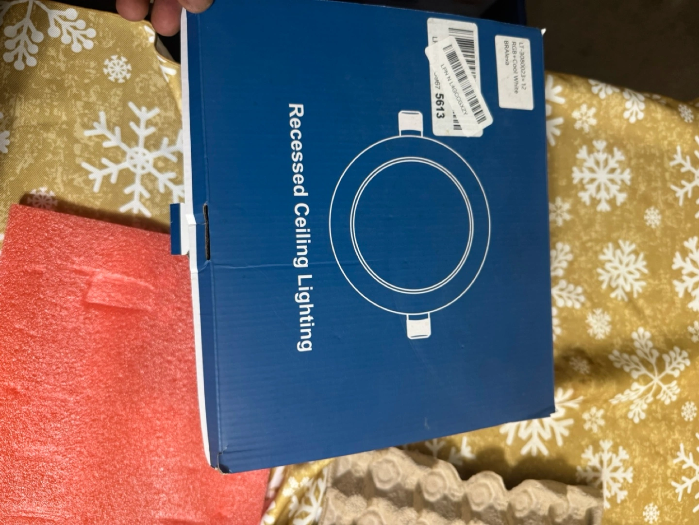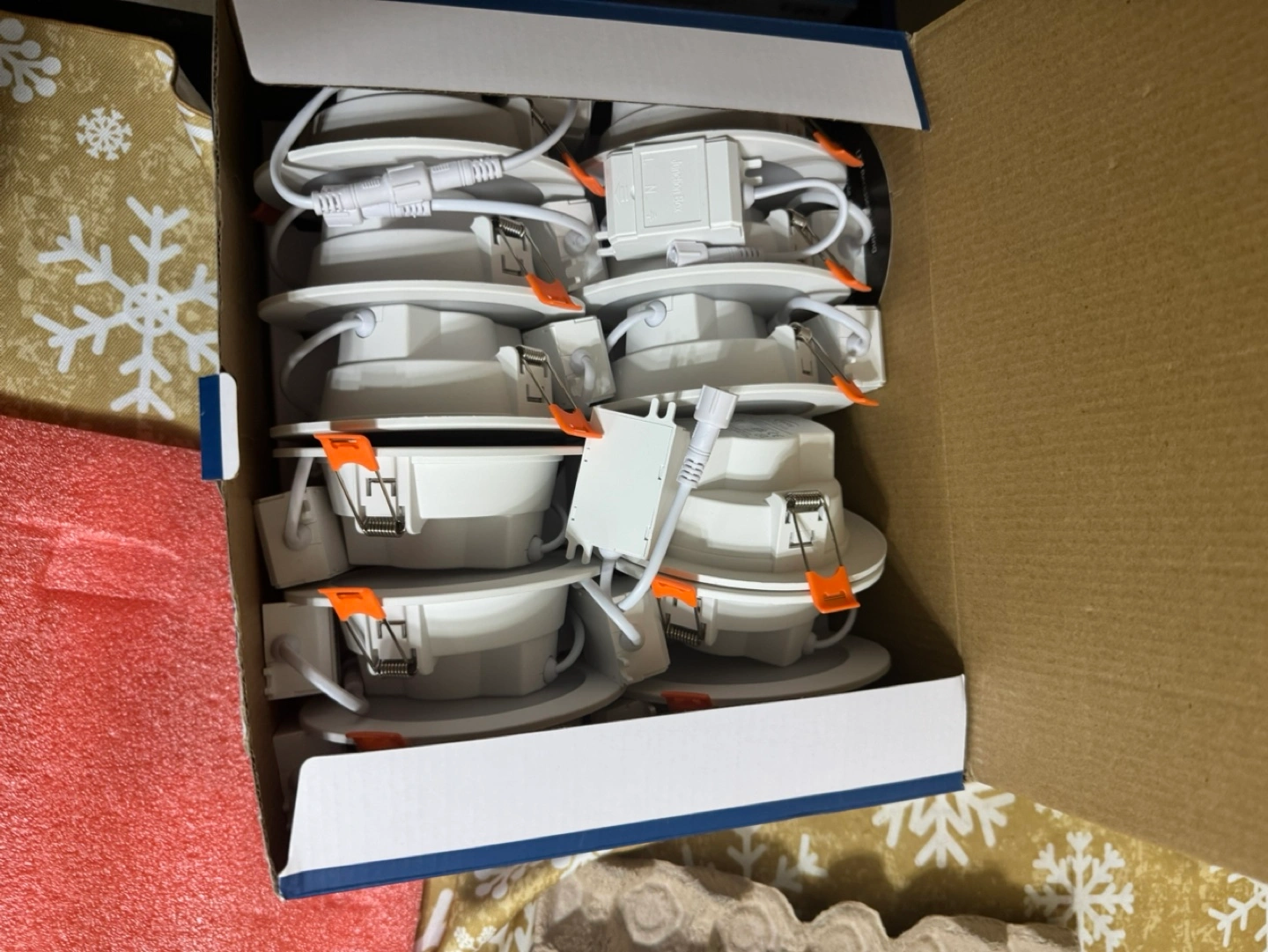 New, unopened box of 12 recessed ceiling lights. White finish. Easy installation. Perfect for home renovation or new builds.