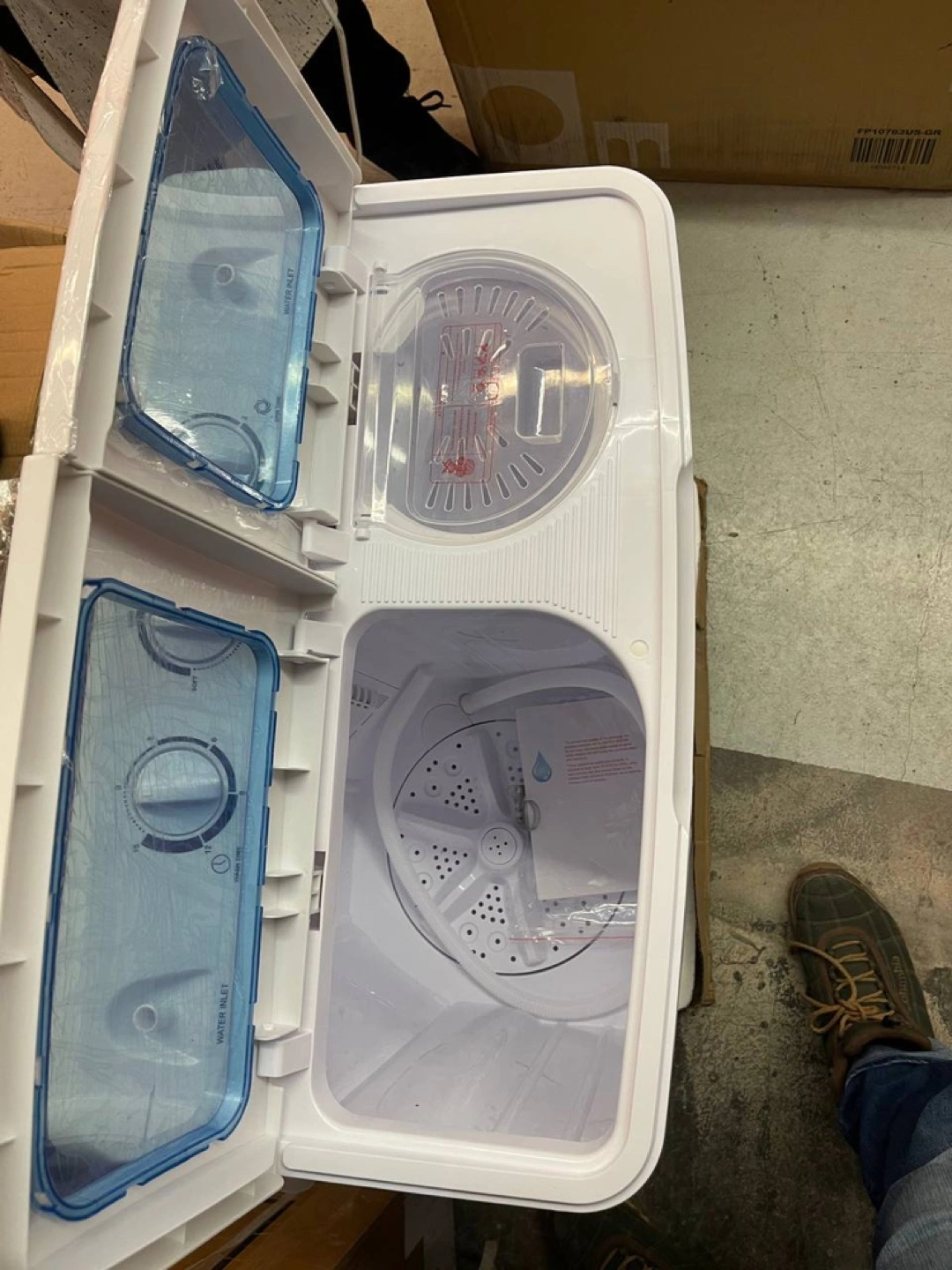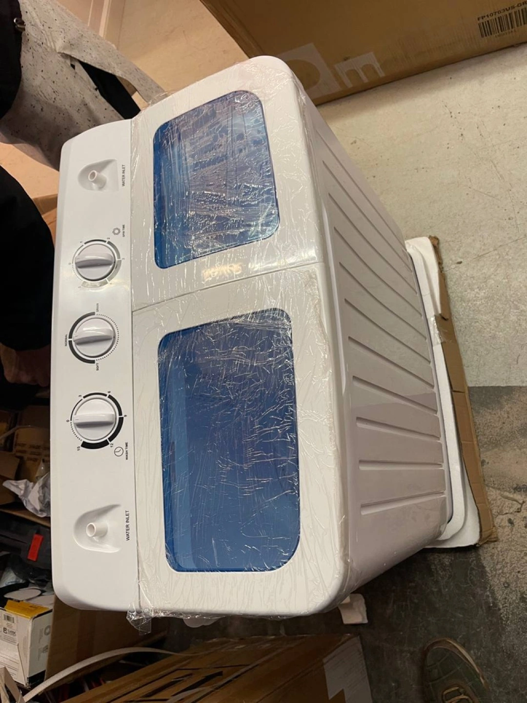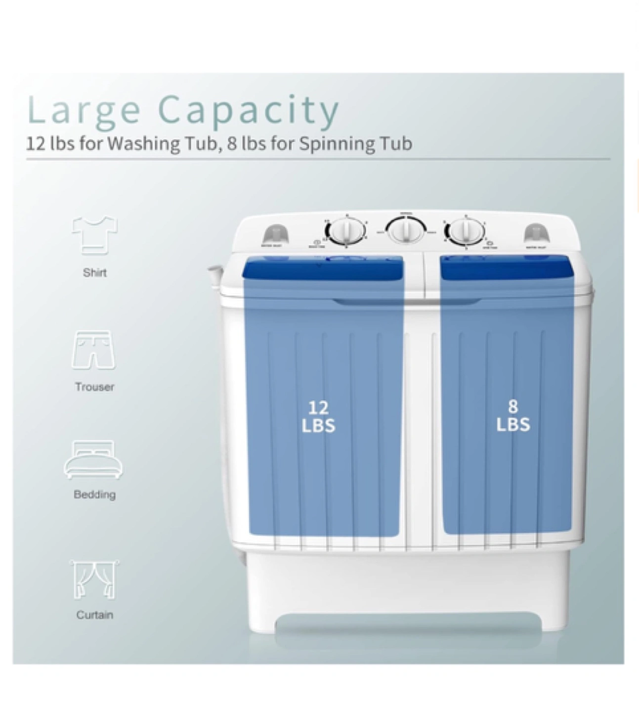 50Portable twin tub washing machine. Features two tubs, one for washing and one for spinning. Compact design, ideal for small spaces. Durable construction. Includes timer control.