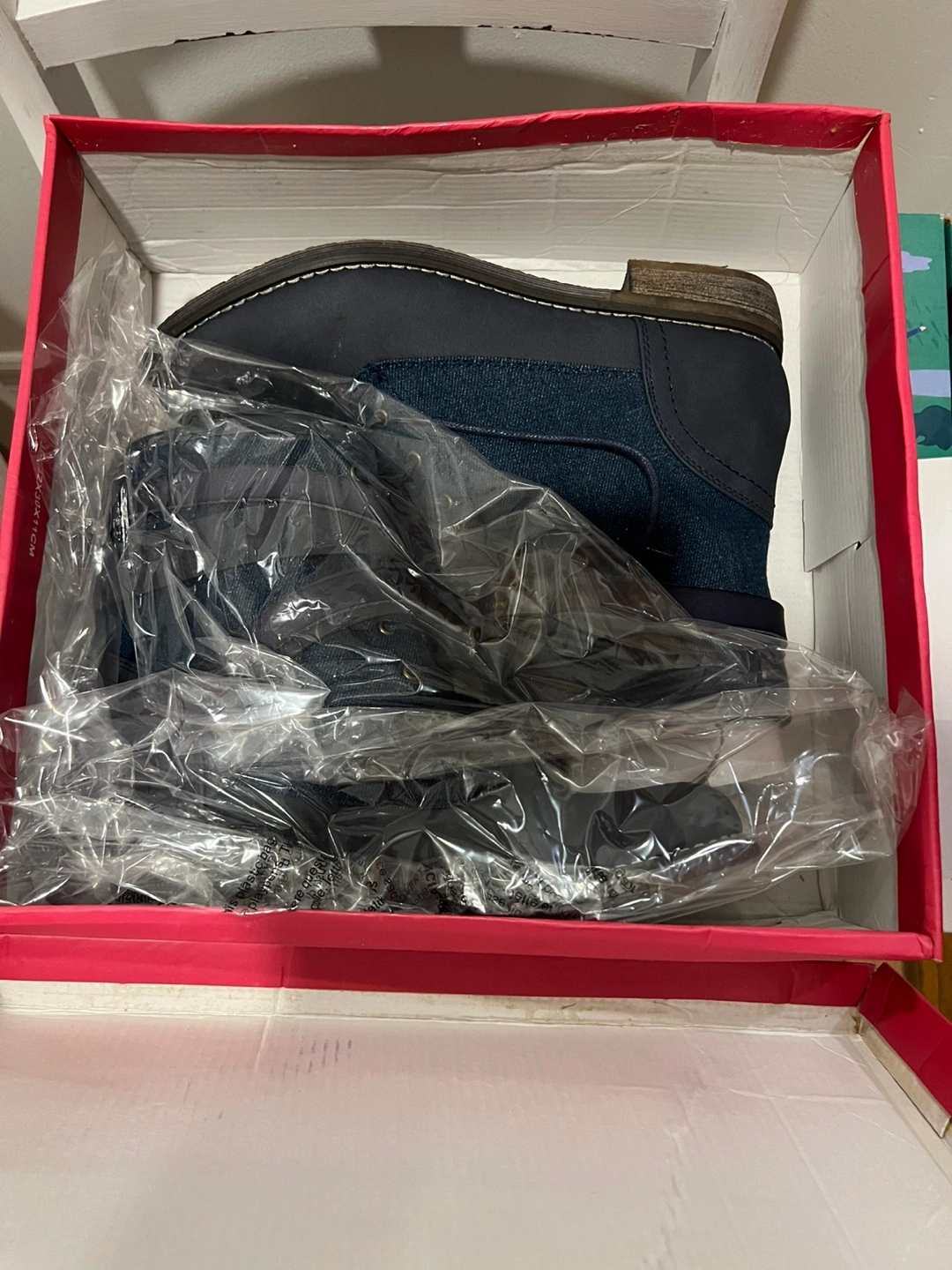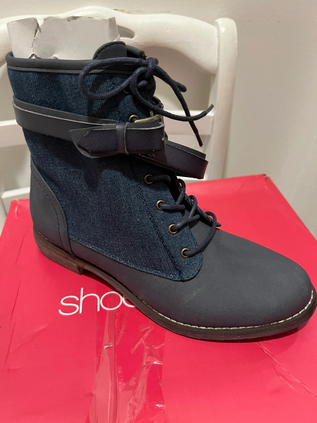 Women's ankle boots. Navy blue denim and leather upper. Lace-up closure. Buckle detail. Low block heel. New with box.