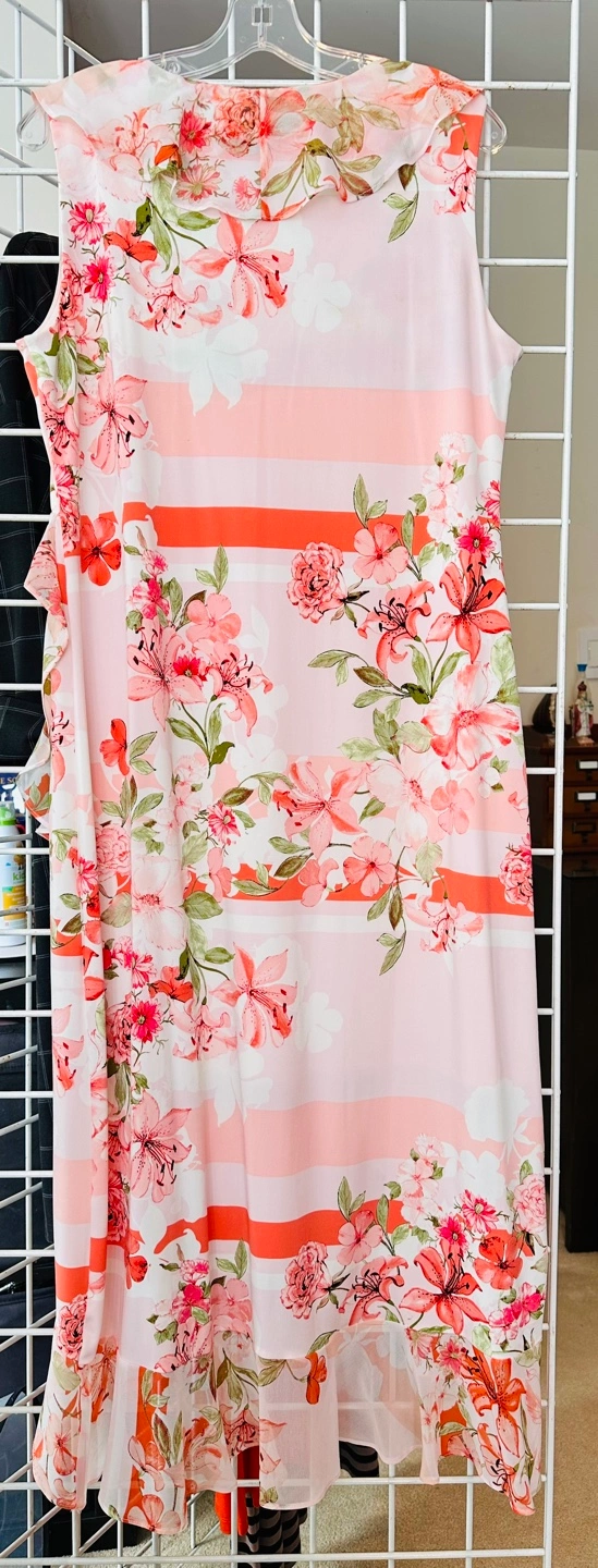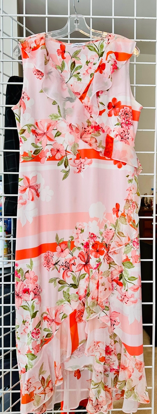 Beautiful sleeveless knee-length dress. Features a flattering wrap design and a pretty floral print. Size large. Ruffled hemline.