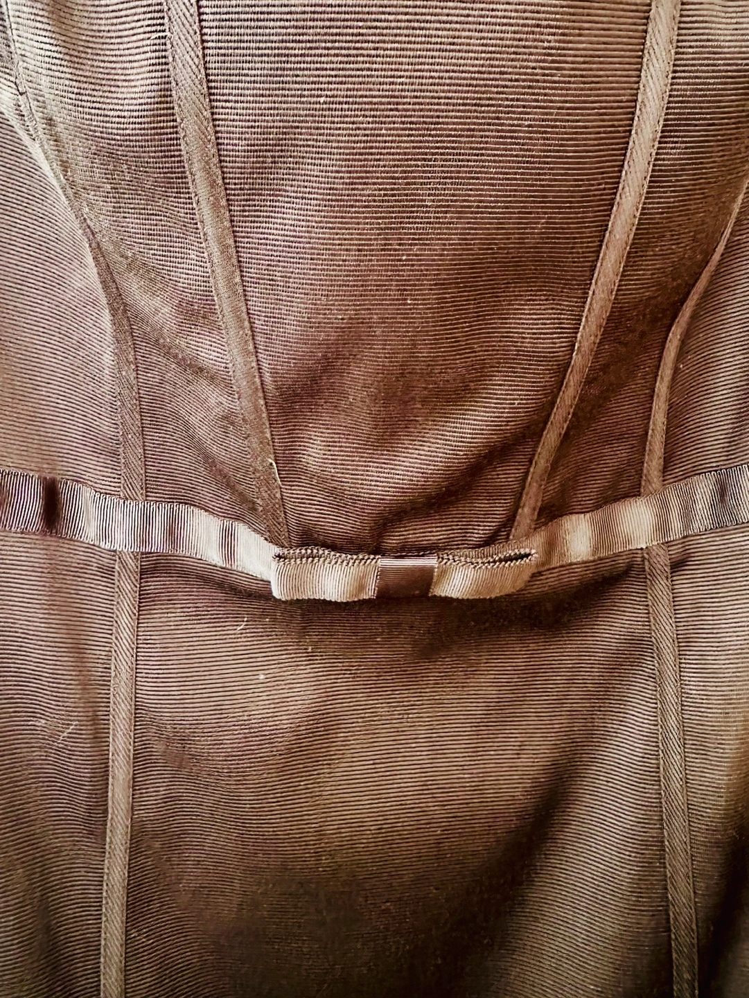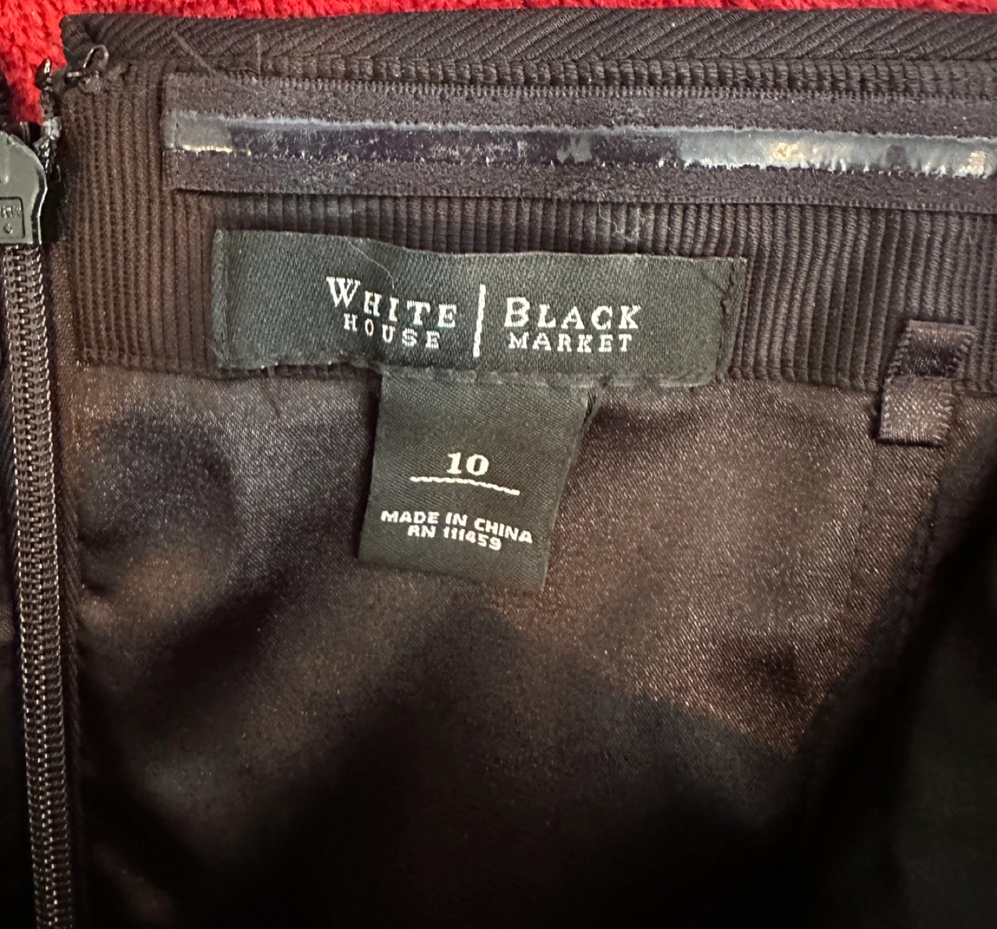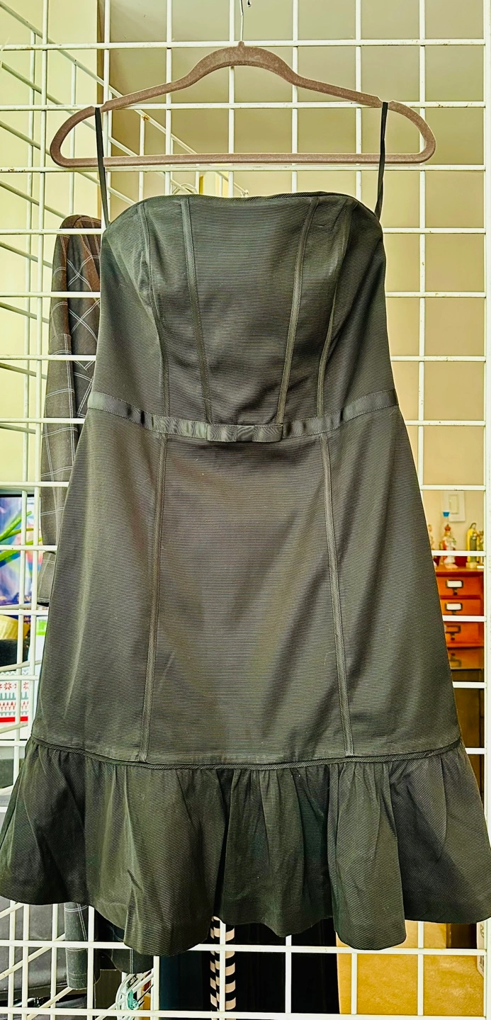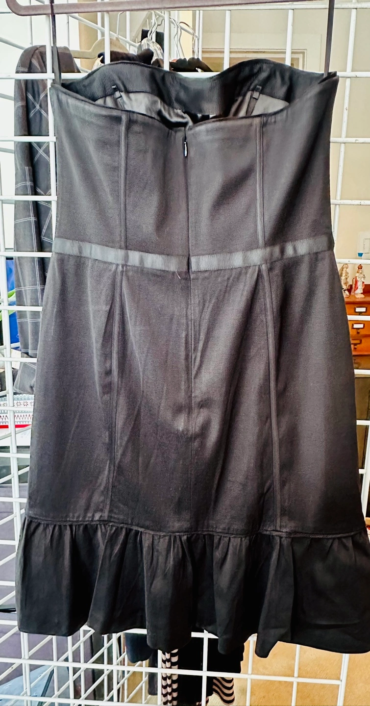 Black strapless dress. Size 10. Features a fitted bodice and a ruffled hem. Back zipper closure and ribbon detail at the waist.
