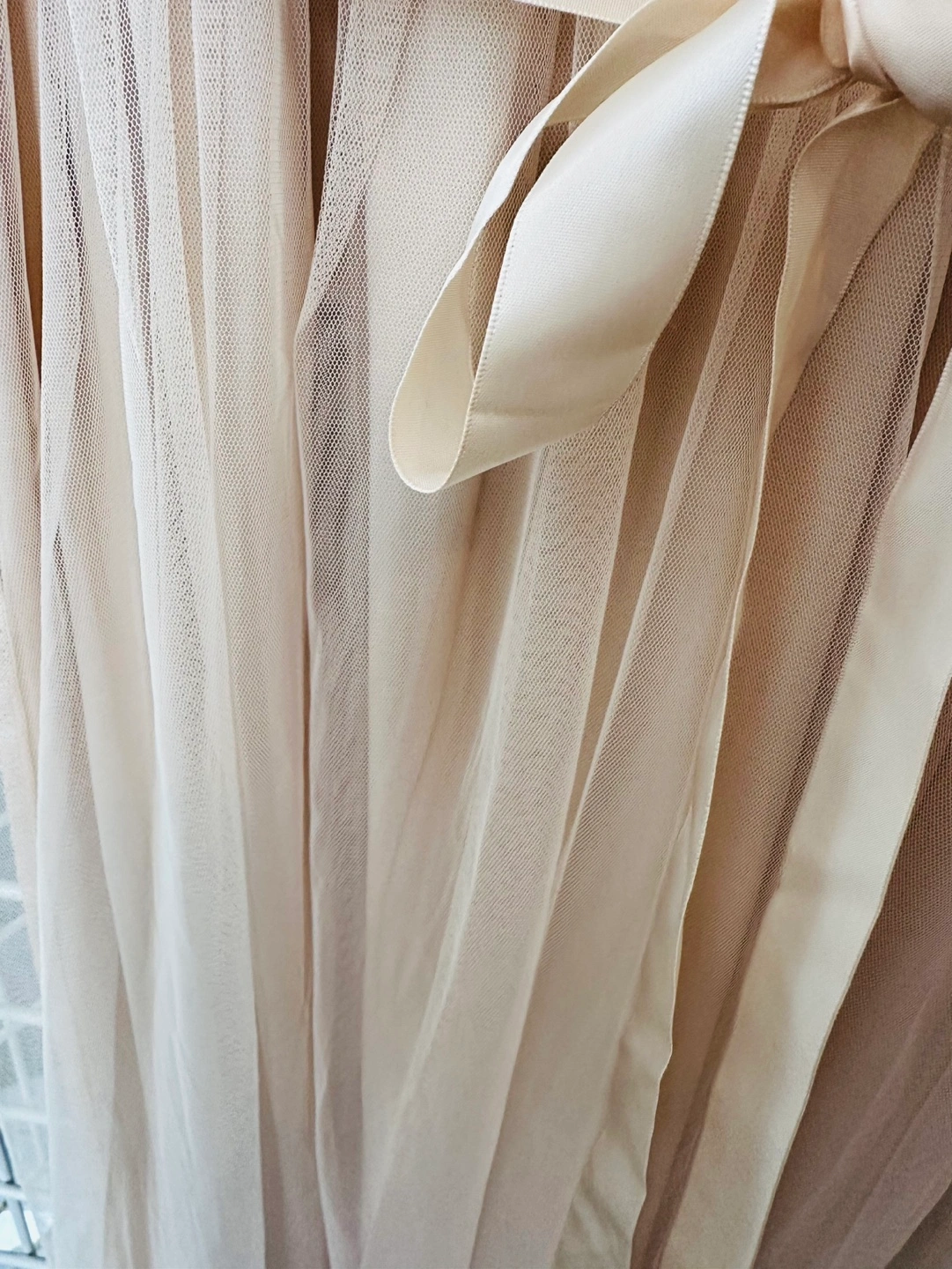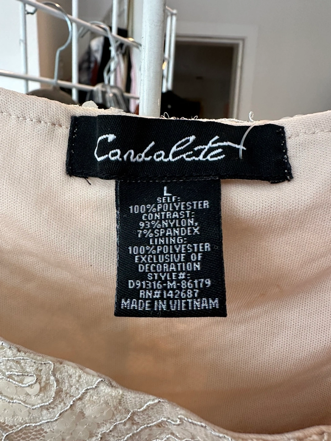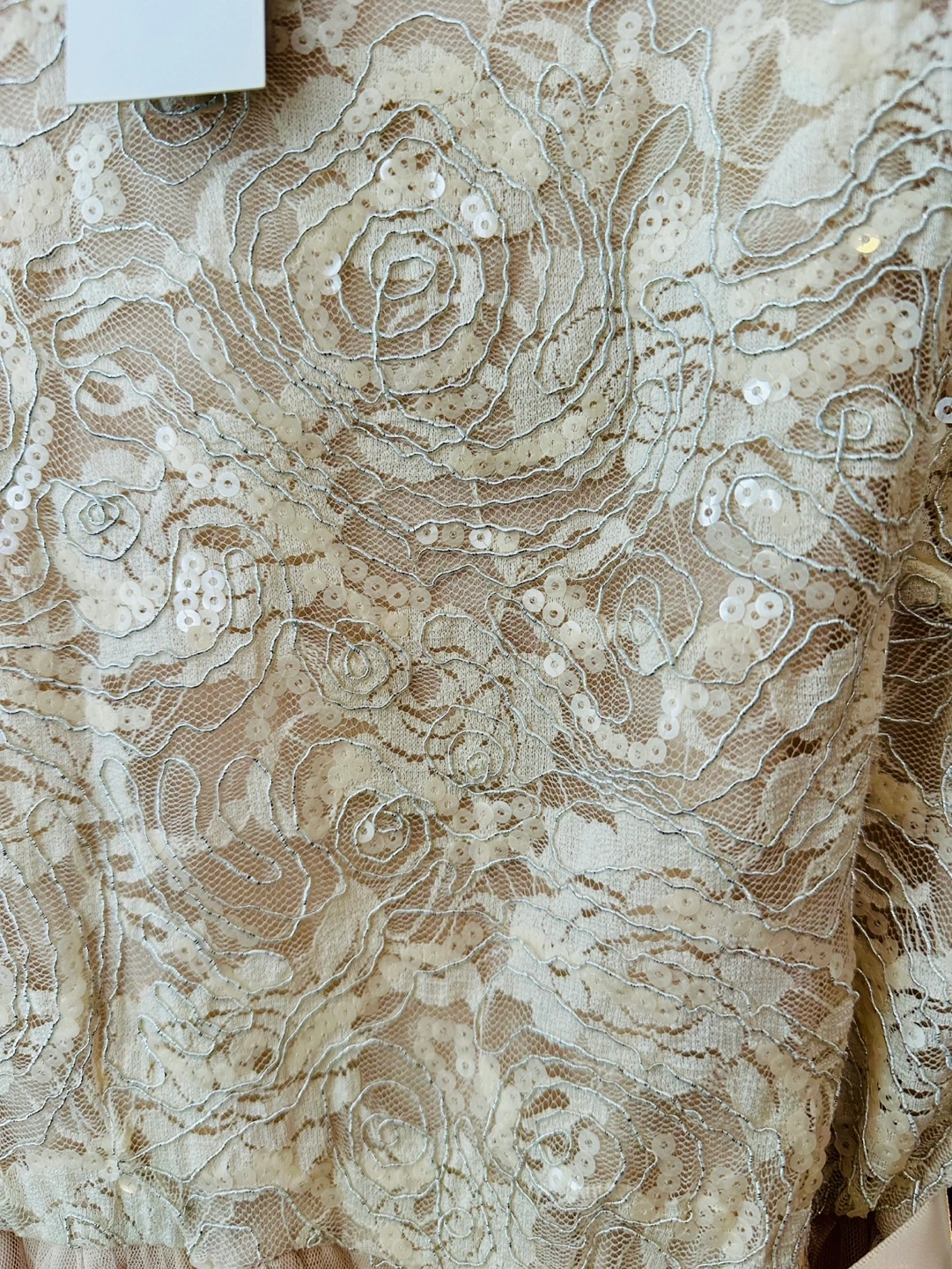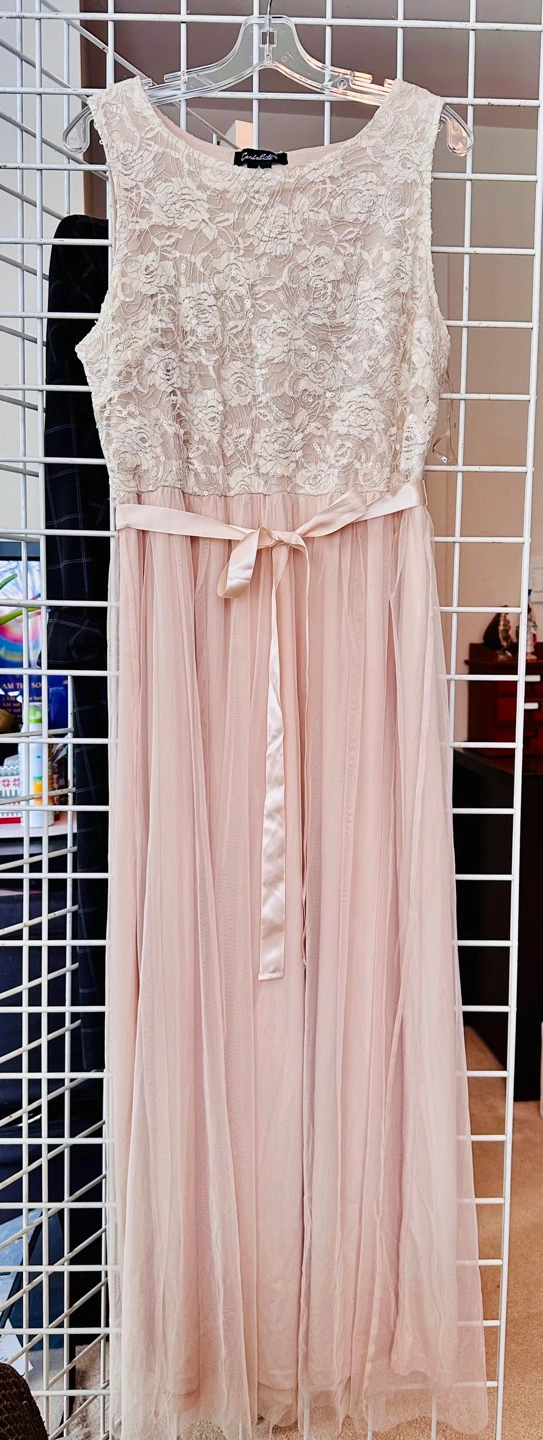 Beautiful blush pink maxi dress. Lace bodice with sequined details. Flowy tulle skirt. Satin ribbon waist tie. Size large. Brand new.