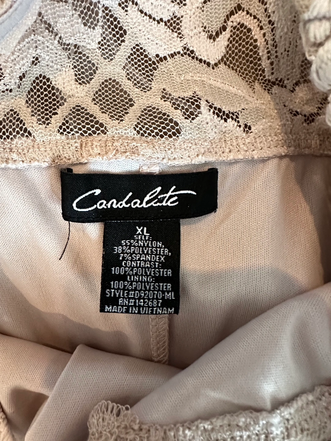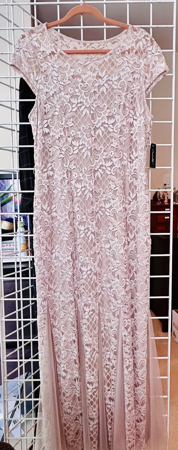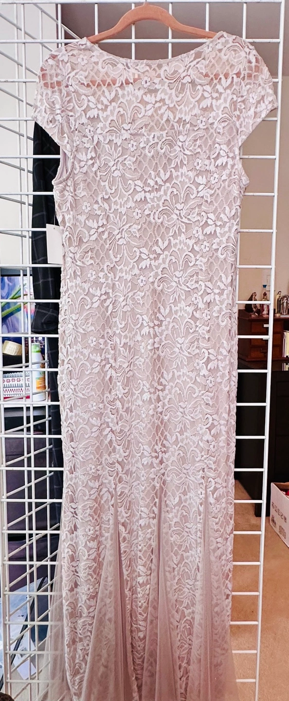 Beautiful blush-coloured long dress. Lace detailing throughout. Short sleeves. Fit and flare silhouette. Size XL. Made in Vietnam.