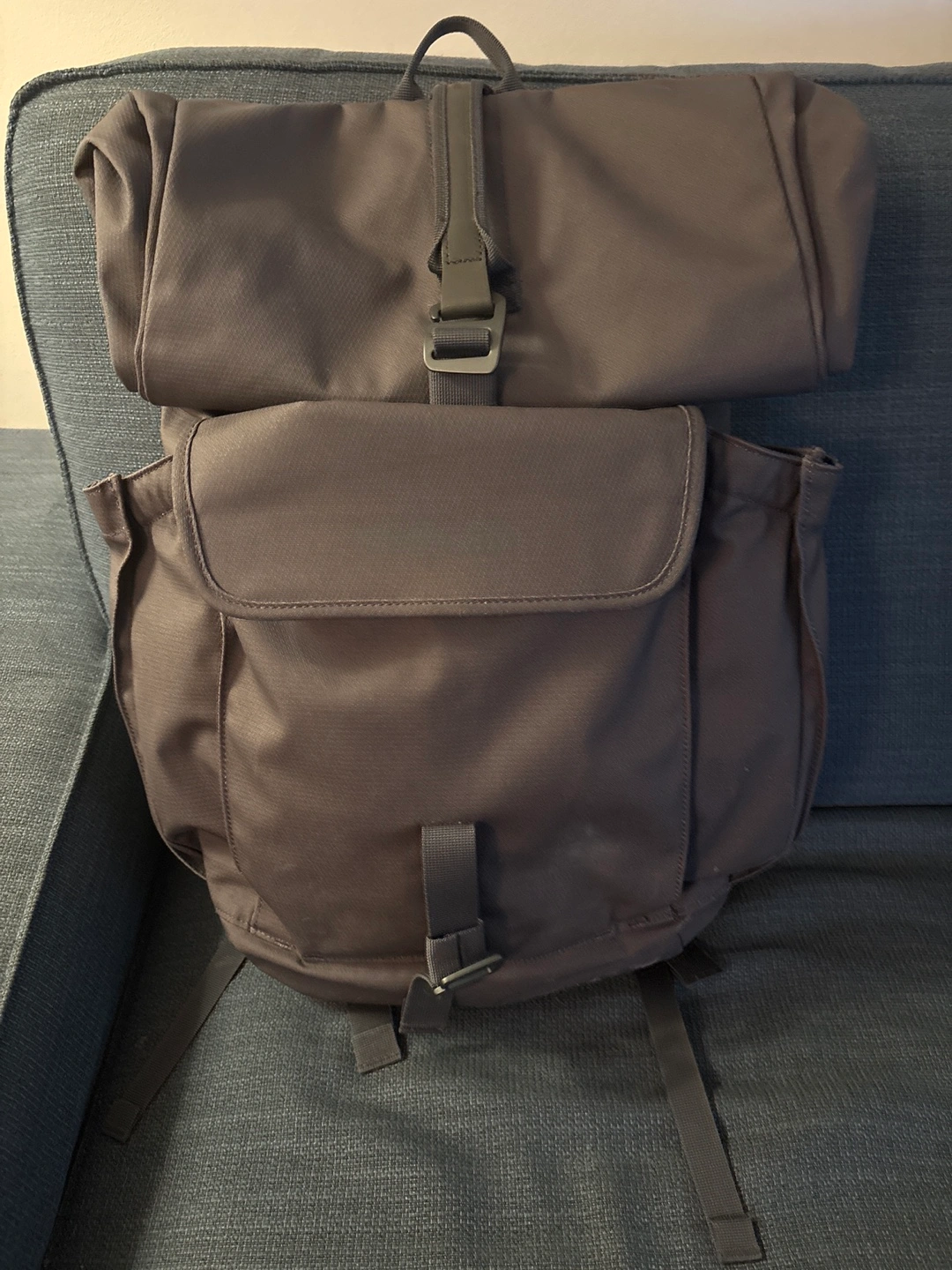 Durable rolltop backpack. Dark gray color. Multiple compartments. Adjustable straps. Rainproof. Perfect for everyday use or travel.