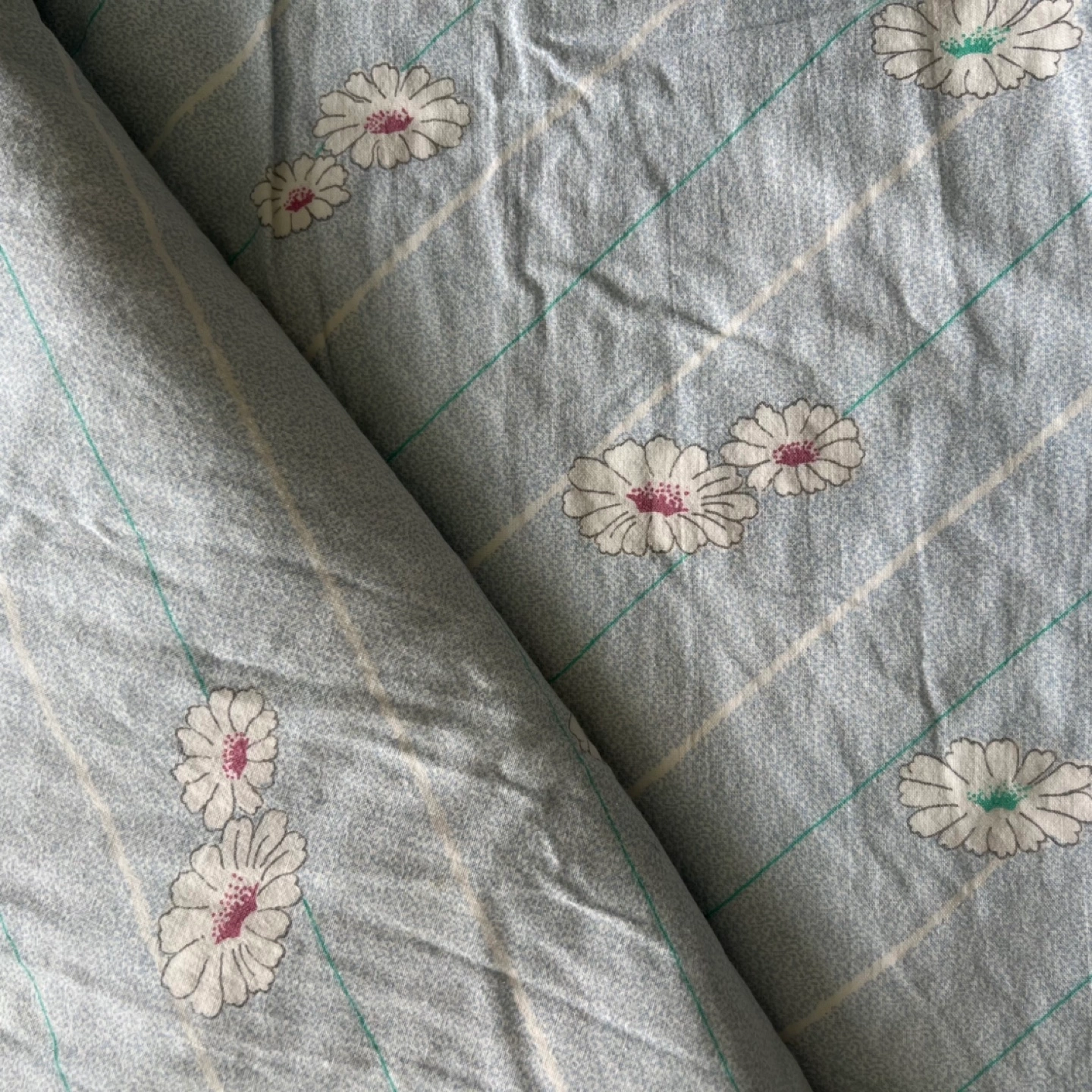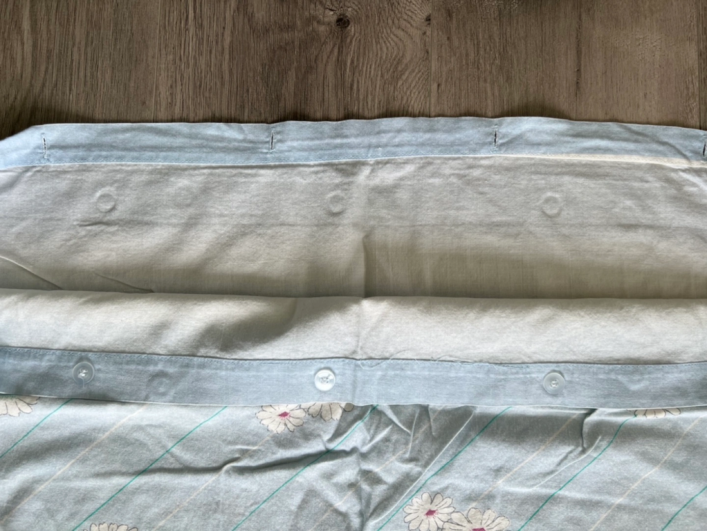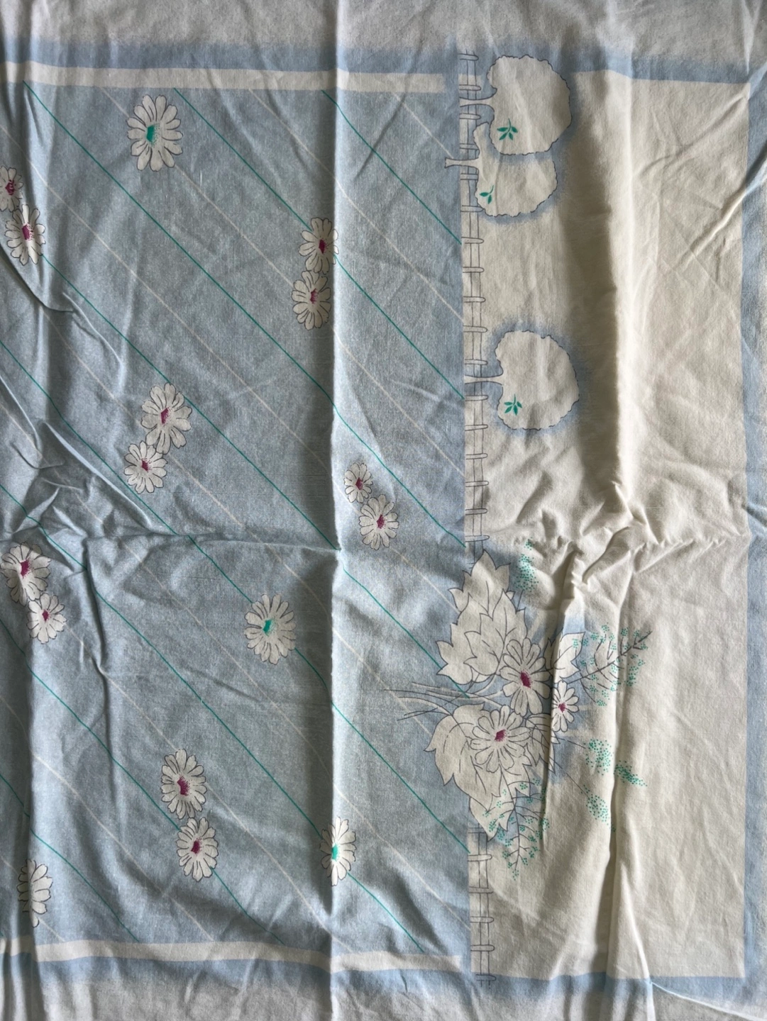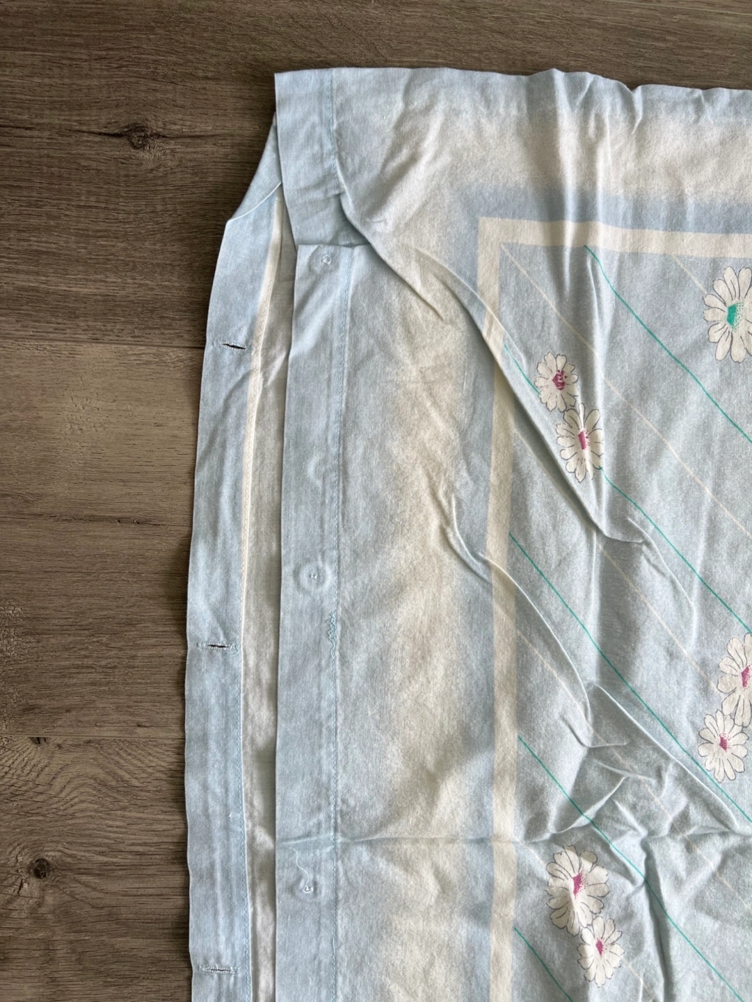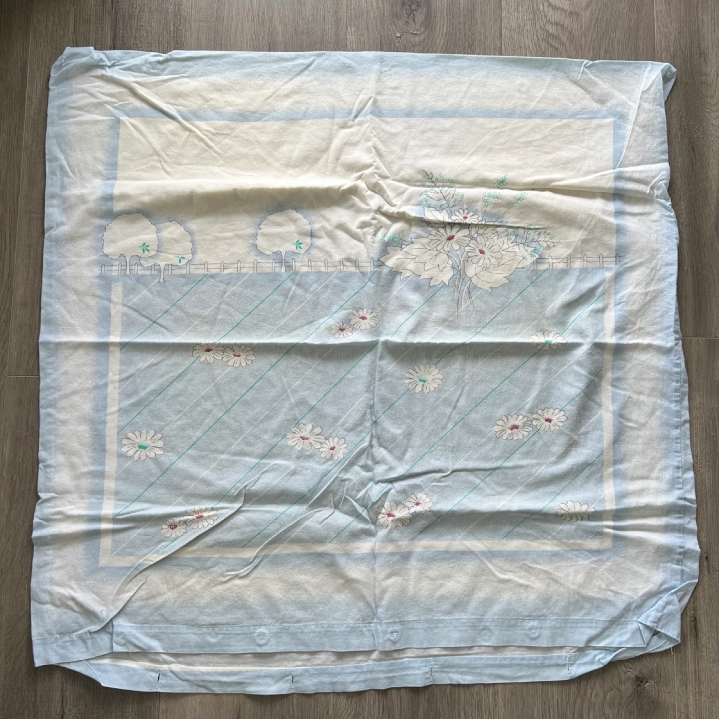 Light blue and off-white duvet cover. Features a floral pattern with daisies and trees. Button closures. Shows some wear.