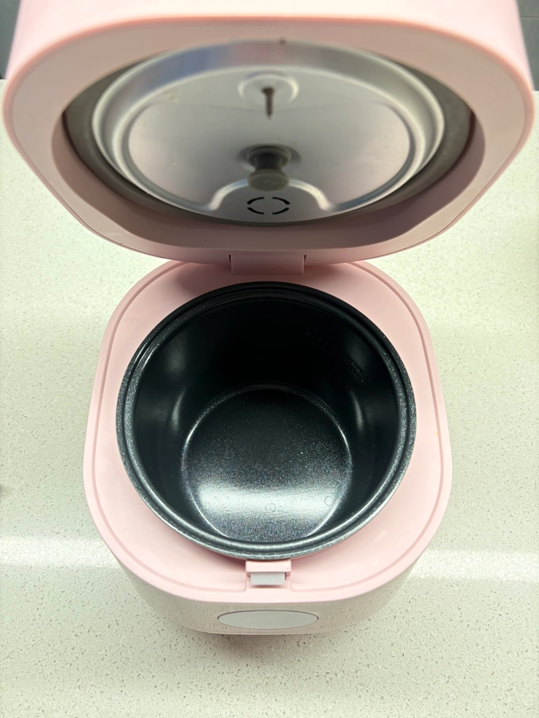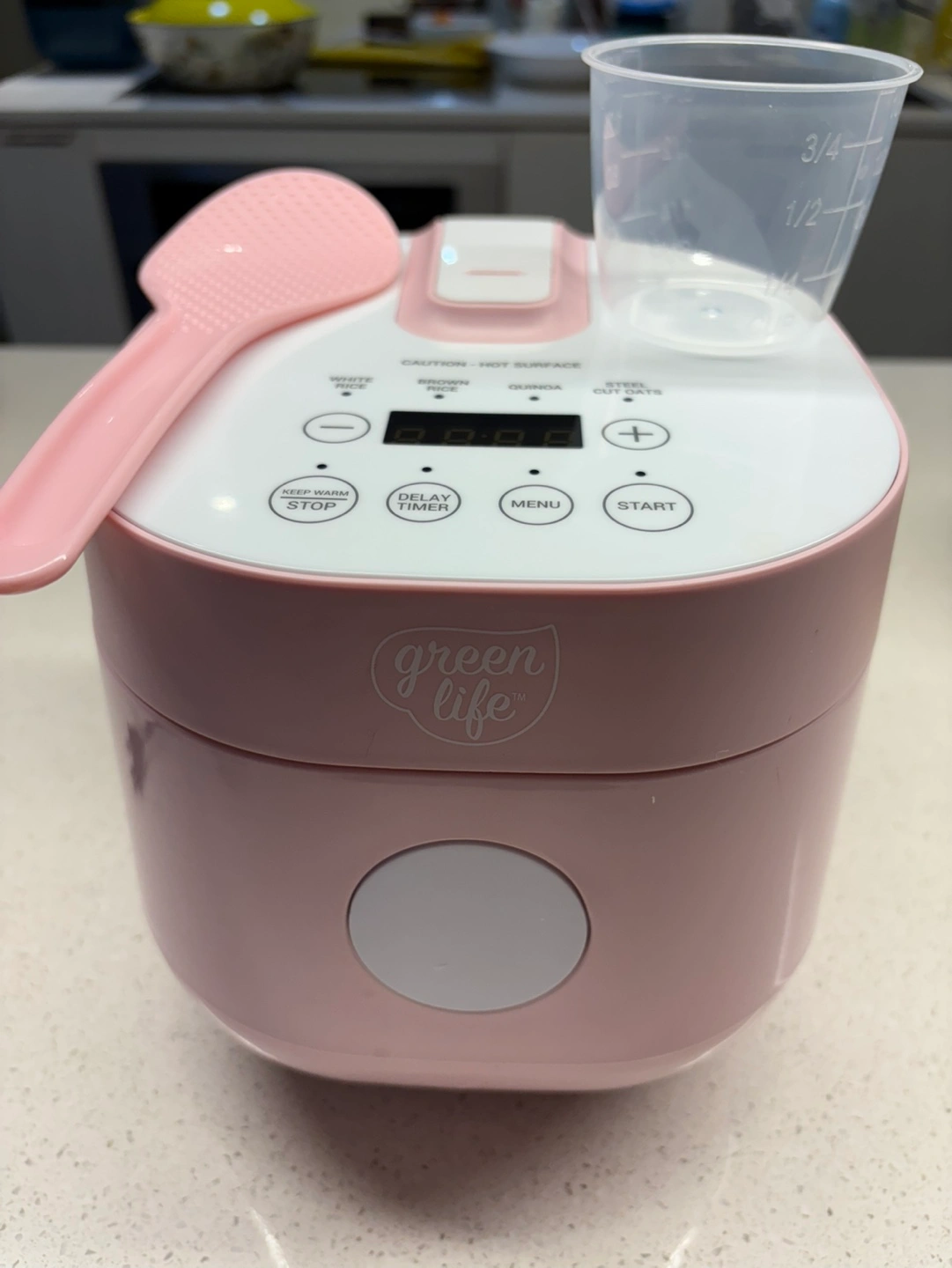 Adorable pink mini rice cooker(2- Cup). Cooks white rice, brown rice, quinoa, and steel-cut oats. Includes rice paddle and measuring cup. Delay timer and keep warm functions. Gently used. :)