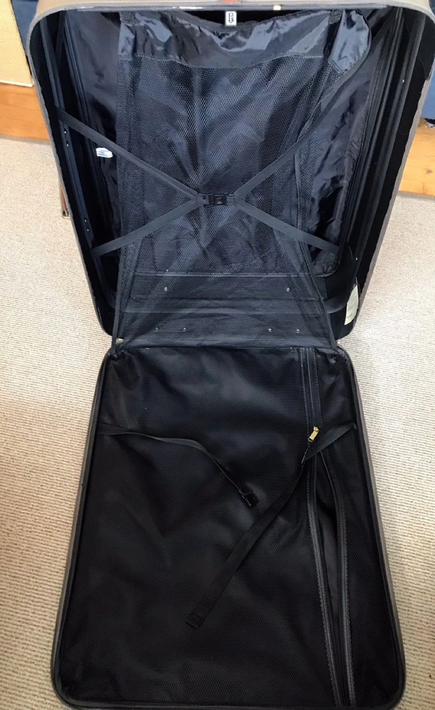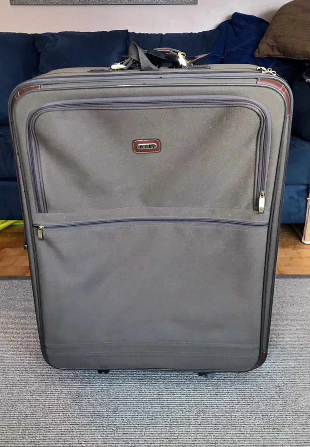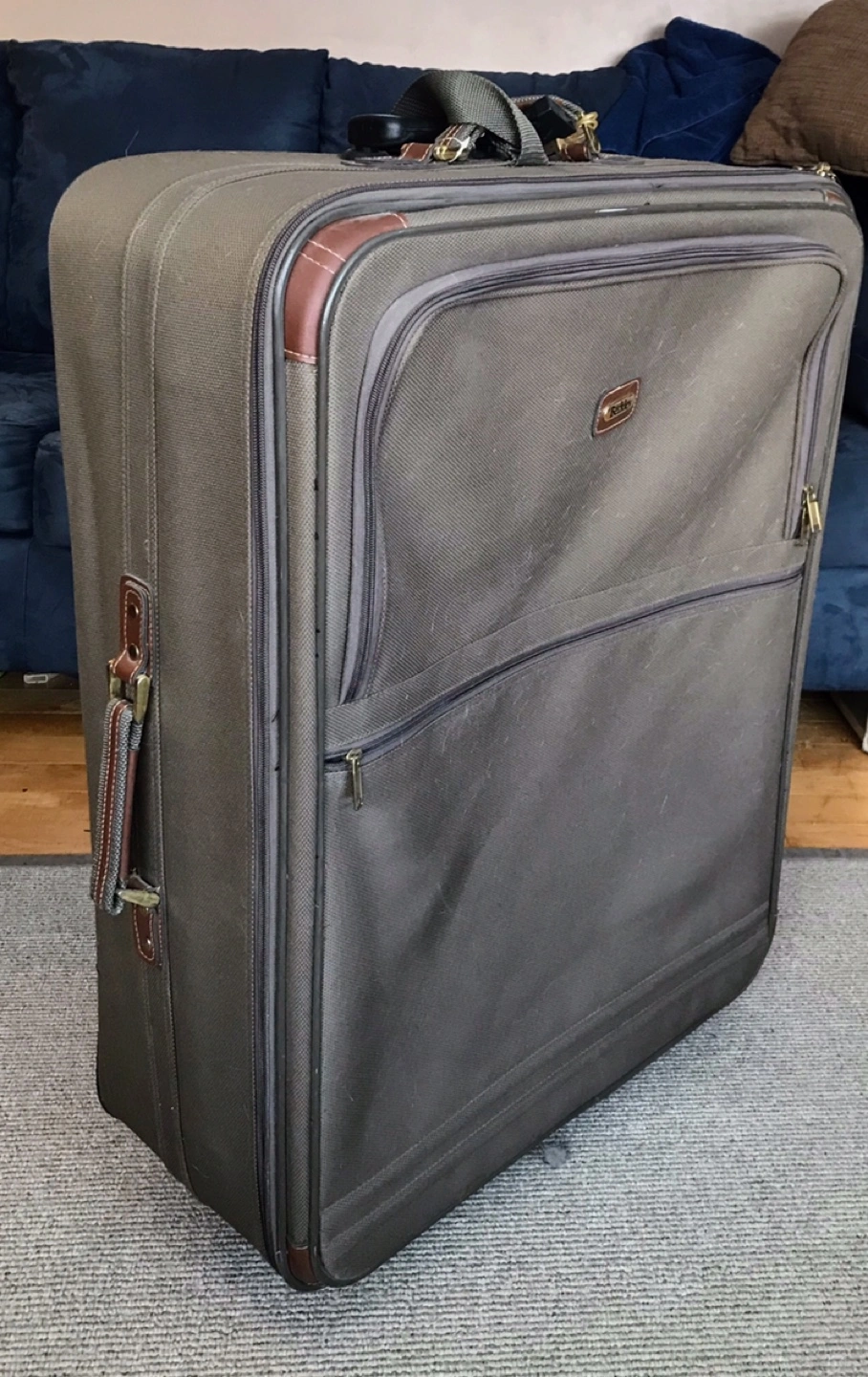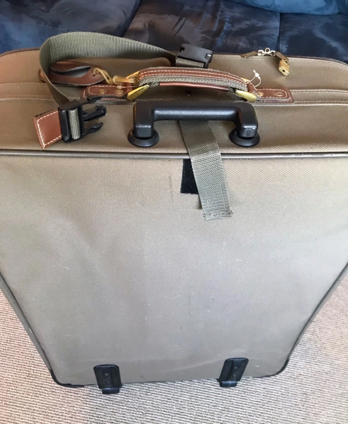 130Large vintage rolling suitcase. Durable canvas material. Brown leather accents. Wheels and handle included. Exterior has two large pockets as shown. Interior has one large mesh zippered pocket on the lid, 5 hooks for hanging clothes, a mesh cover and straps for lid and base. Used twice. Cat-friendly home.