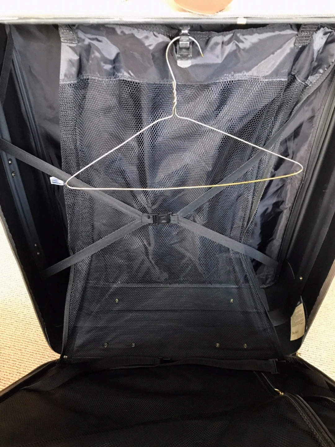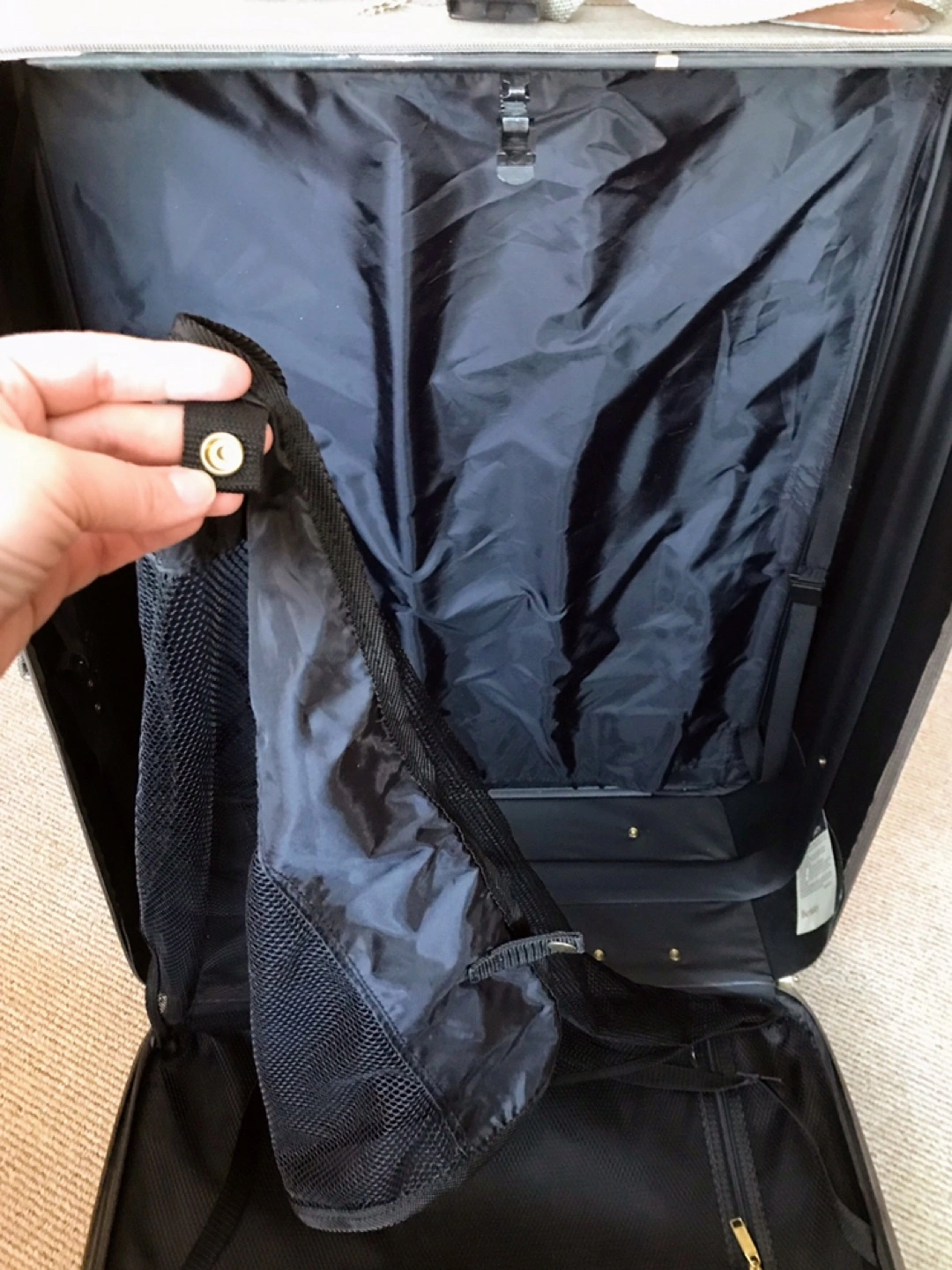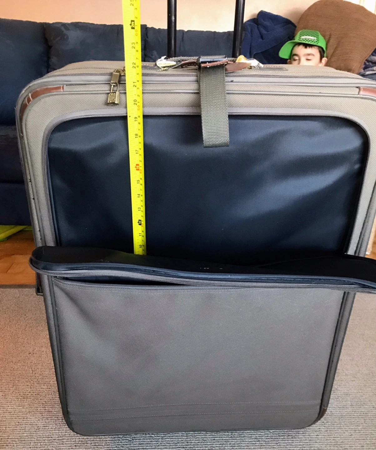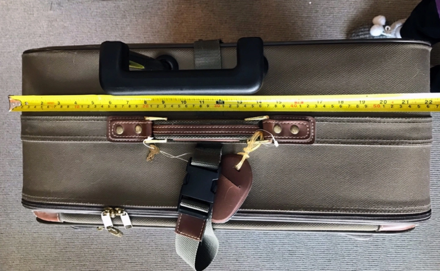 130Large vintage rolling suitcase. Durable canvas material. Brown leather accents. Wheels and handle included. Exterior has two large pockets as shown. Interior has one large mesh zippered pocket on the lid, 5 hooks for hanging clothes, a mesh cover and straps for lid and base. Used twice. Cat-friendly home.
