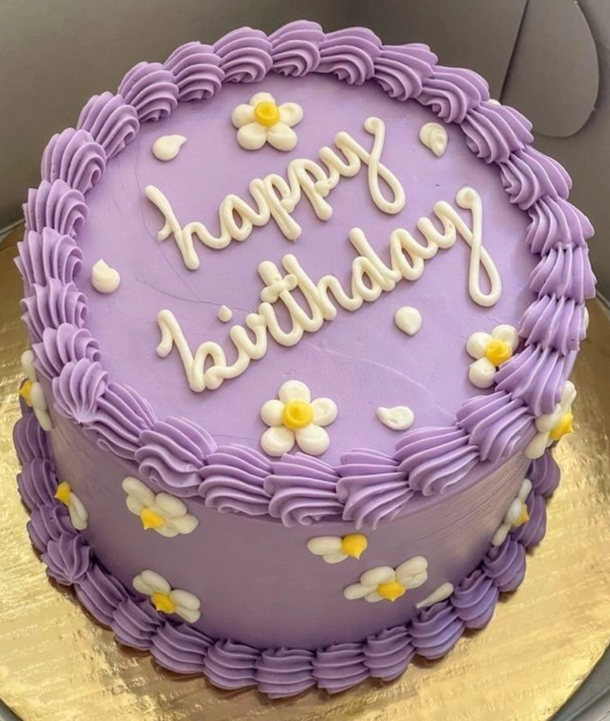 Vanilla cake layers with Oreo cream filling, purple icing, piped daisies and customizable writing (happy birthday in this image). MADE FRESH