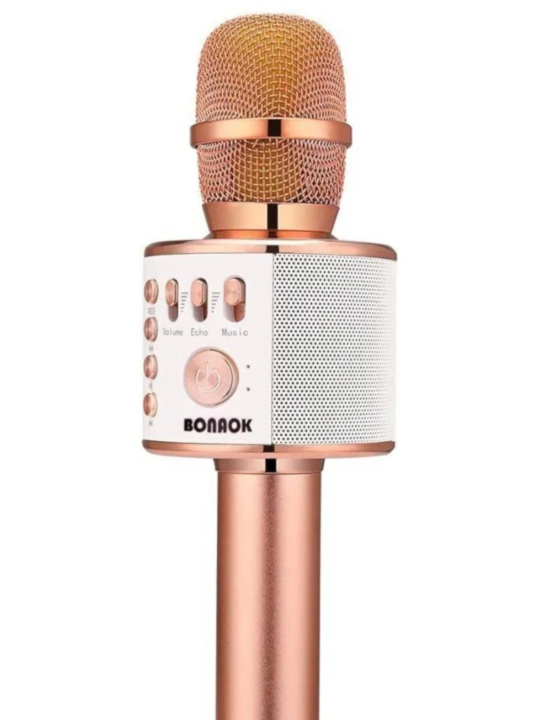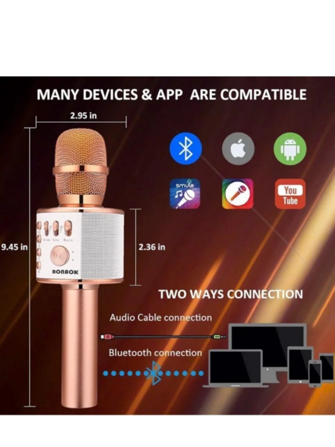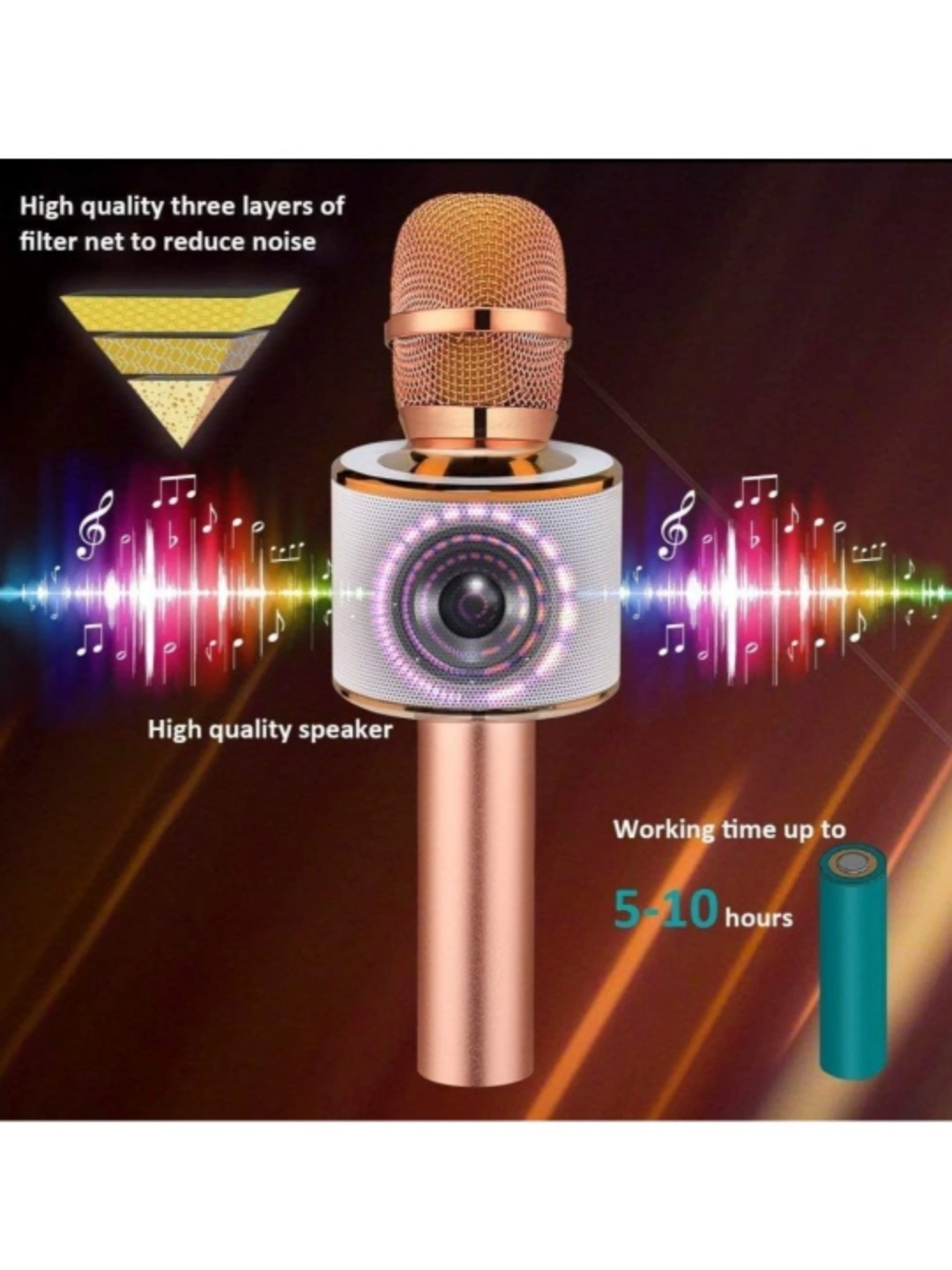 77Portable karaoke microphone. Rose gold coloured. Bluetooth and wired connection options. LED lights. Rechargeable battery. Multiple functions: volume, echo, music control. Long battery life.