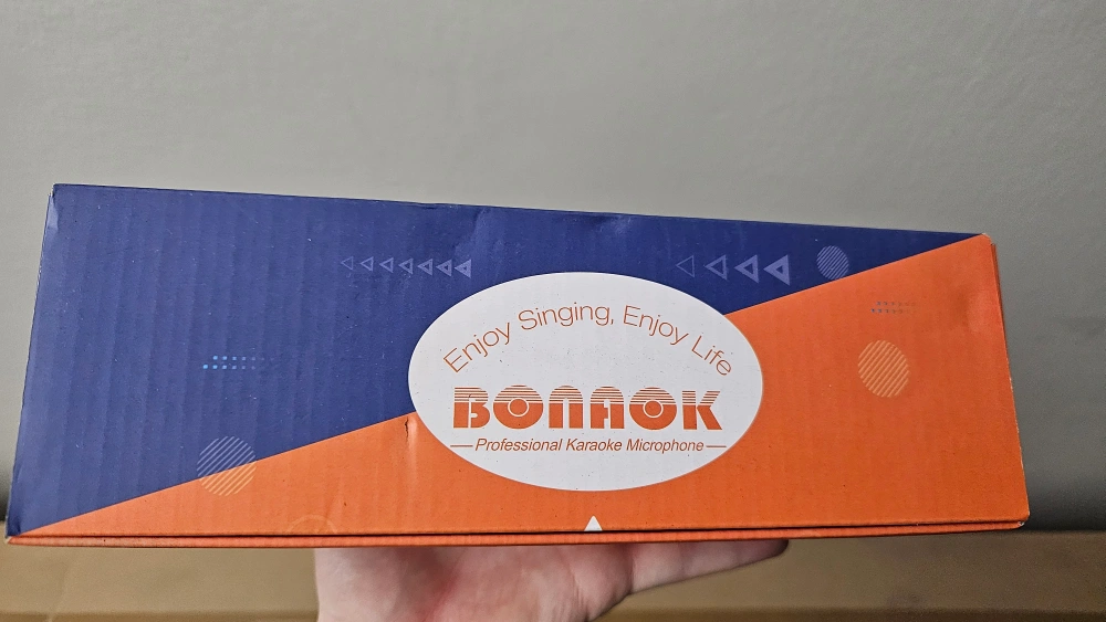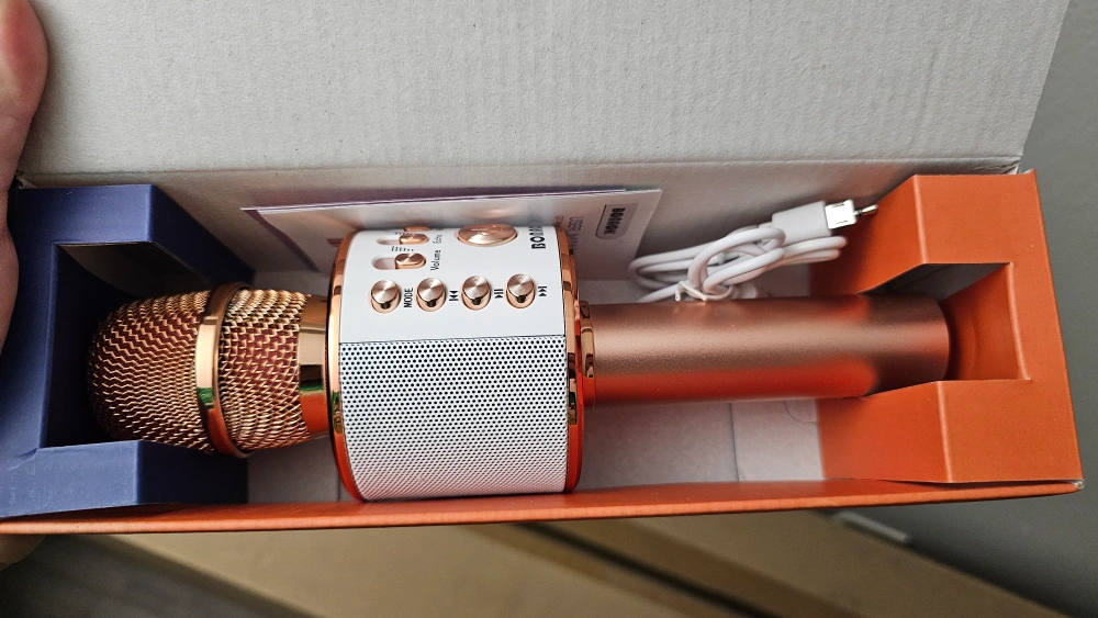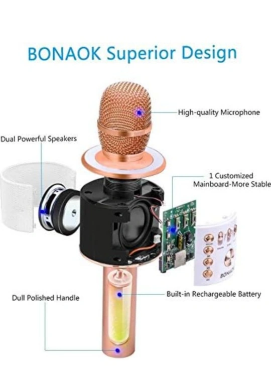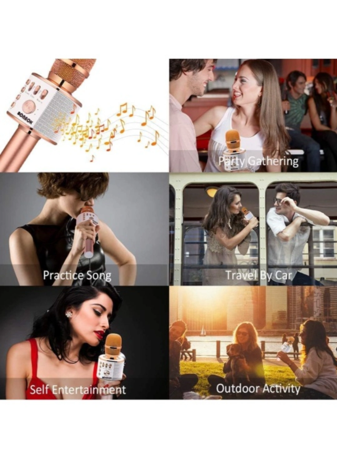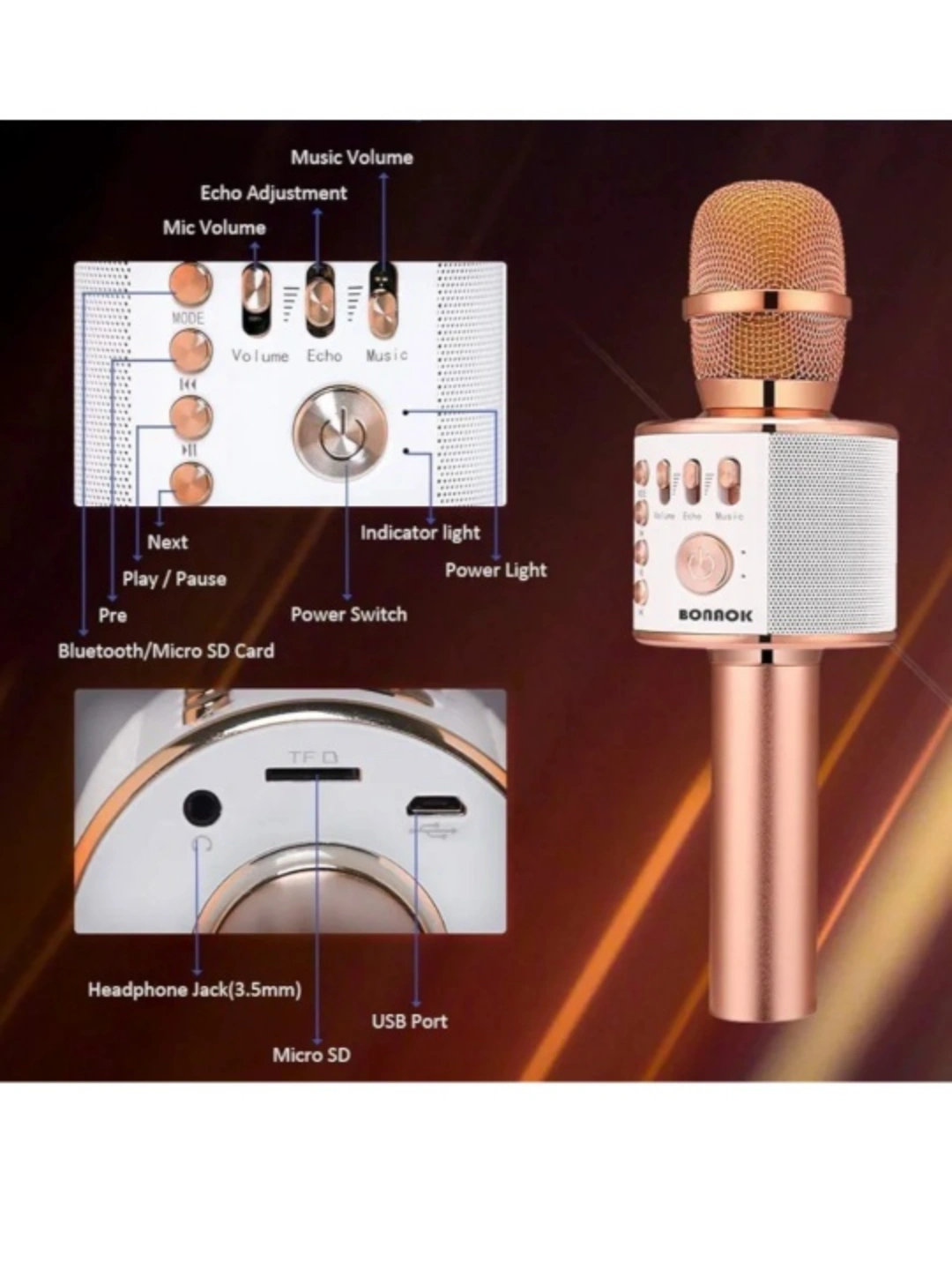 77Portable karaoke microphone. Rose gold coloured. Bluetooth and wired connection options. LED lights. Rechargeable battery. Multiple functions: volume, echo, music control. Long battery life.