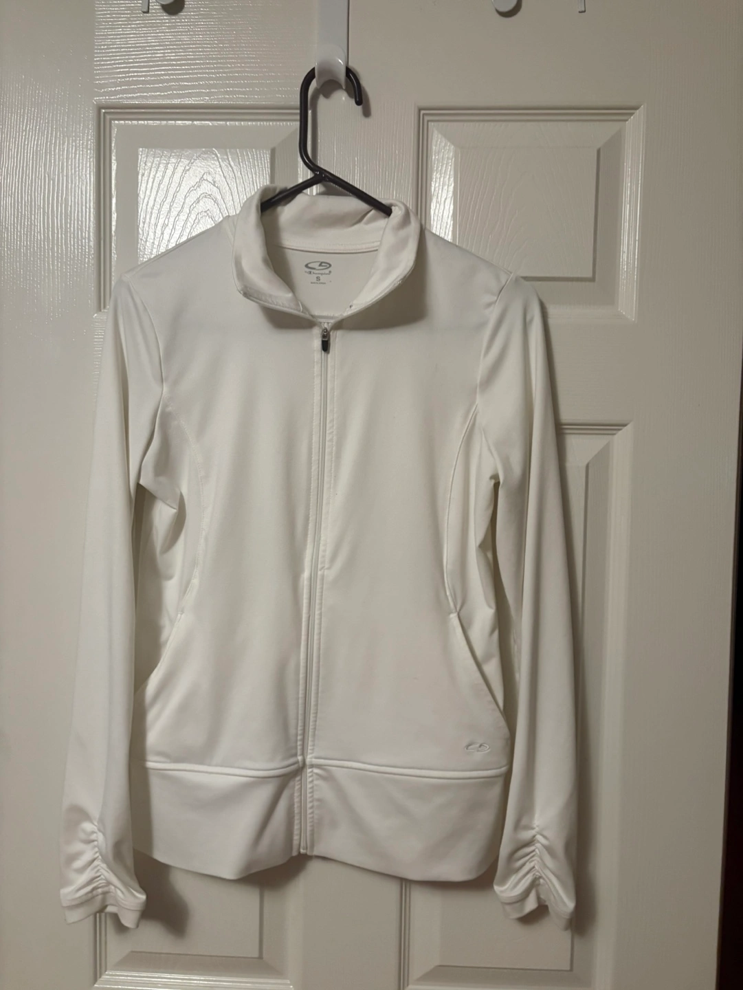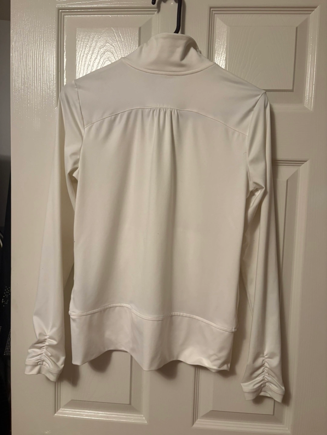 White zip-up jacket. Long sleeves with ruched cuffs. Small size. Perfect for layering or workouts. Good condition smoking pot free home.