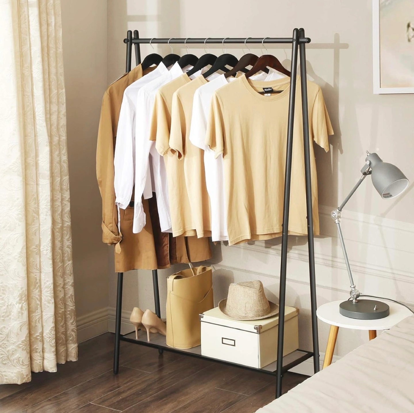 Freestanding garment rack. Features a hanging rail and lower shelf. Durable metal construction. Ideal for bedrooms or closets. Simple assembly required.