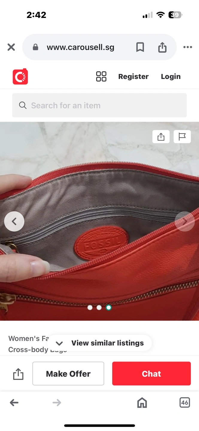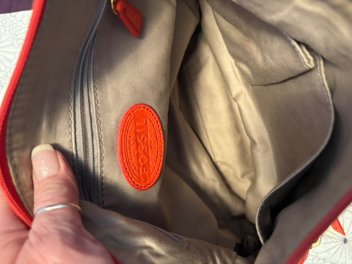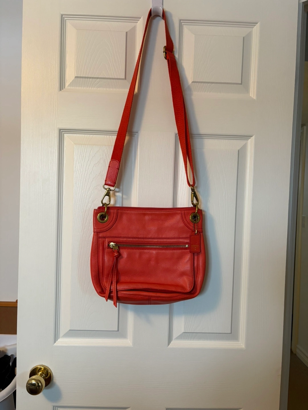 Pre-owned Fossil crossbody bag. Coral colored leather. Adjustable strap. Interior zip pocket. Perfect for everyday use.
