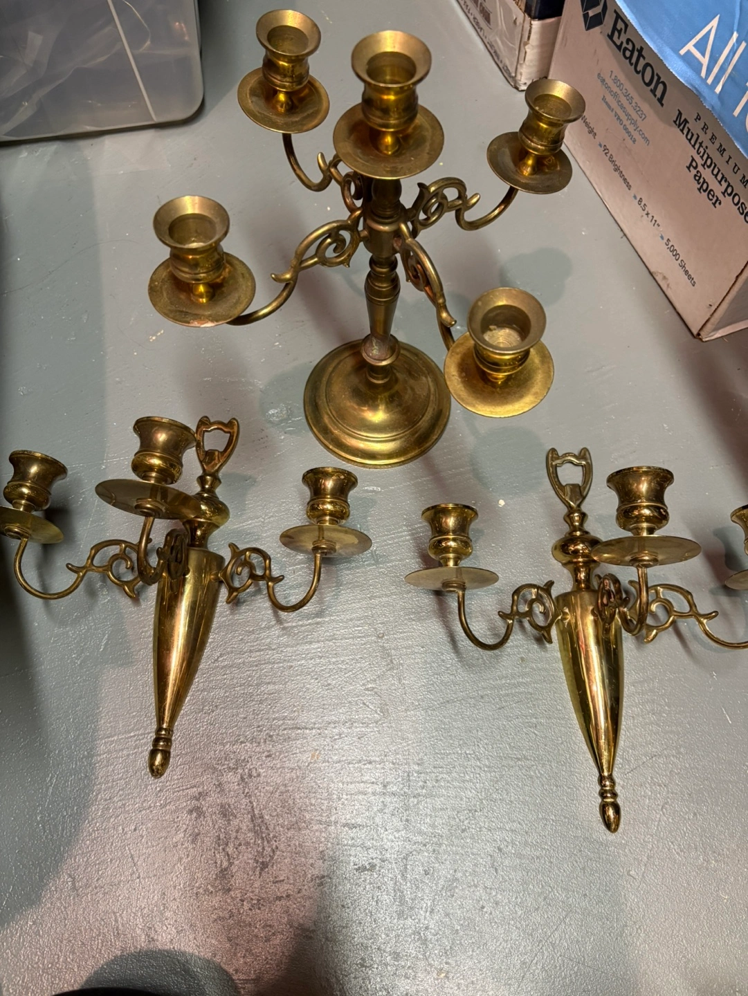 Ornate solid brass candle holders. Five-arm centerpiece and two matching three-arm wall sconces. Elegant design, perfect for home decor.
