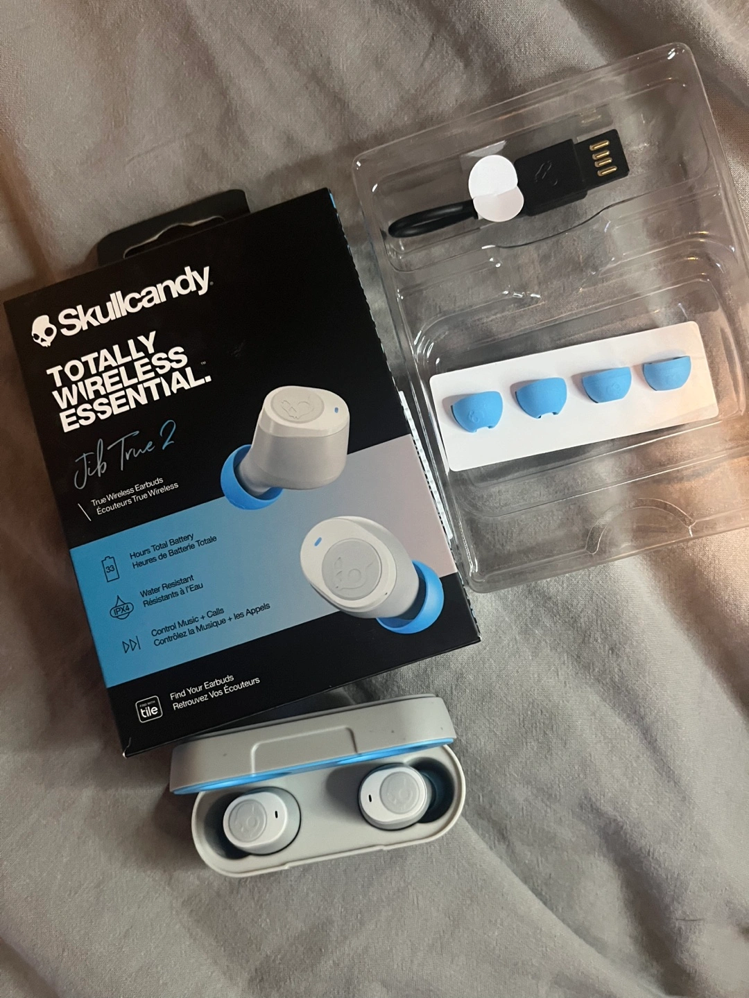 Skullcandy Jib True 2 wireless earbuds. Includes charging case and extra ear tips.