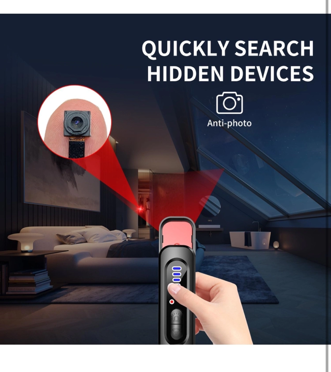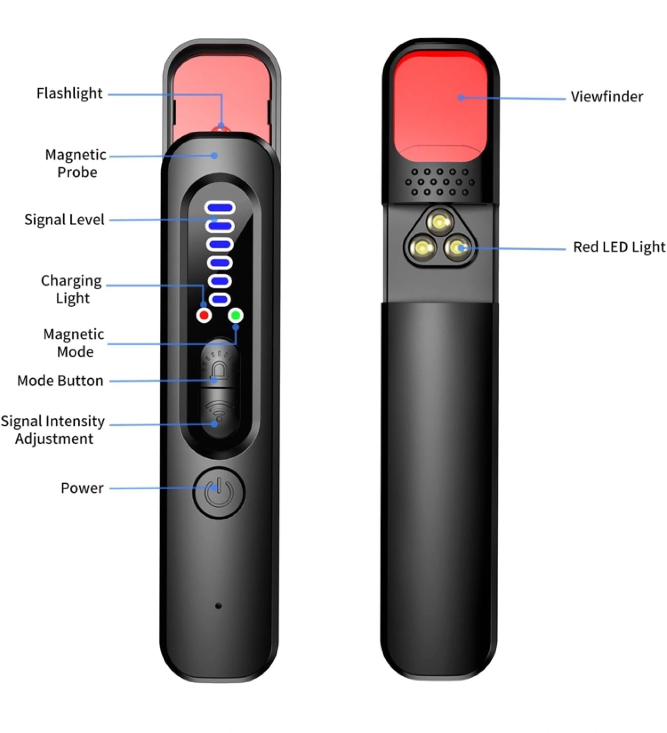 31【Portable Hidden Camera Detector】The wireless signal spy camera detector is about the size of a pen, lightweight and very portable. Whether you are in a hotel or traveling, it can protect your privacy whenever you feel watched or doubt the security of your surroundings. 【Two Kinds of Alarm】Our WiFi signal detector has two alarm modes, one is beeps sound, the other is vibration mode, you can choose any mode you like to work. If you find the beeps sound too noisy, you can choose to tap the power button once and switch to vibration mode. The vibration frequency is high enough that you can also feel the warning. 【Three Detection Modes】Our wireless spy cam finders have wireless signal detection mode, magnetic signal detection mode and camera detection mode. Wireless signal detection mainly detects mobile phones, wireless spy cameras, magnetic signal detection mainly detects GPS tracking, camera detection allows you to easily find the location of the hidden pinhole camera. 【Five levels of Sensitivity】Our Bug sweeper device has five levels of sensitivity to choose from, the signal detection range is 2inch-315inch, the higher the sensitivity, the larger the detectable range, you are free to choose the appropriate sensitivity. As the probe is at the top, please try to align the probe with the detection orientation when using. 25-2-5/п3.7