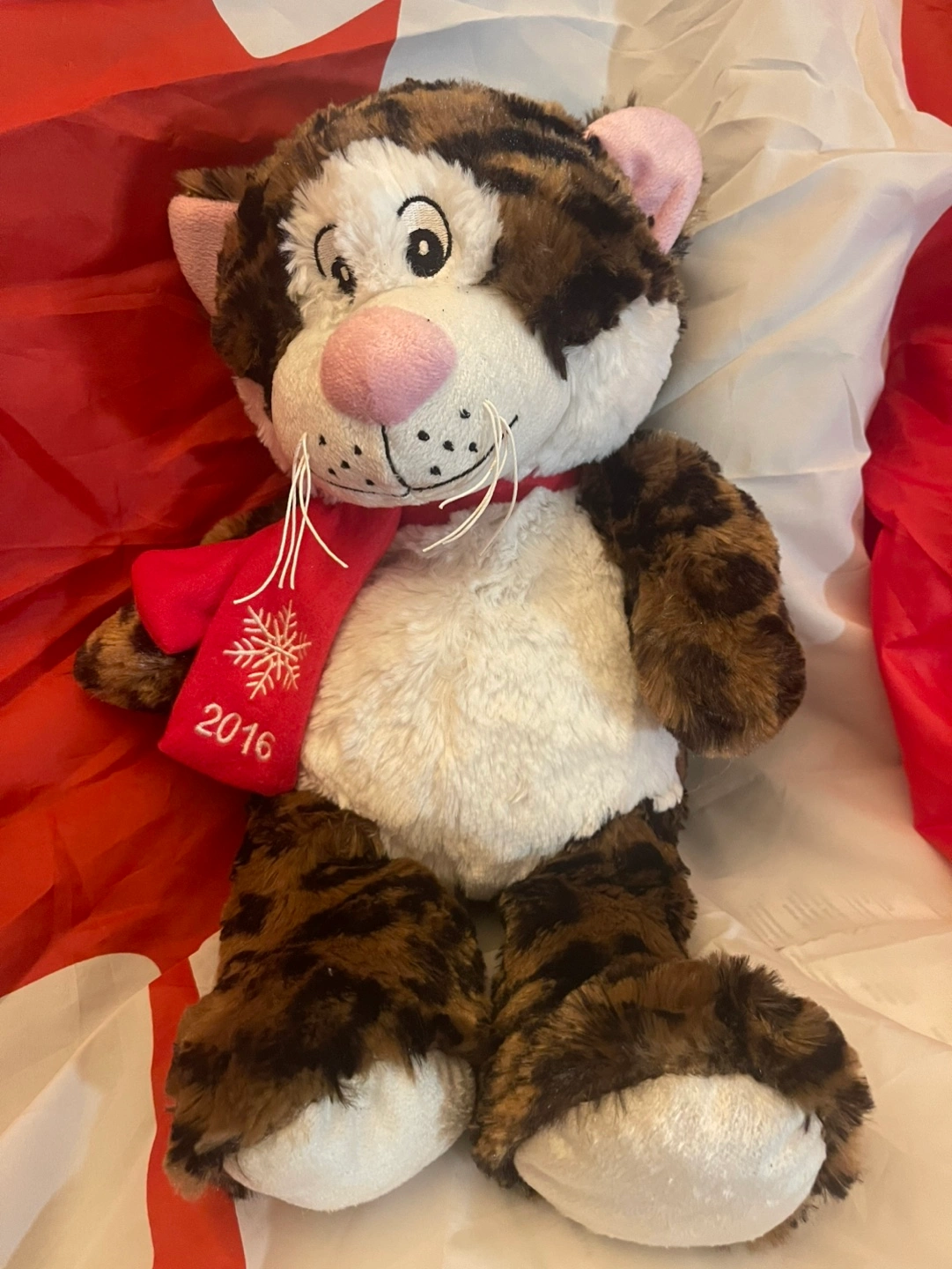 Adorable plush tiger wearing a red scarf. Brown and white fur. 2016 embroidered on scarf. Perfect for collectors or gift.