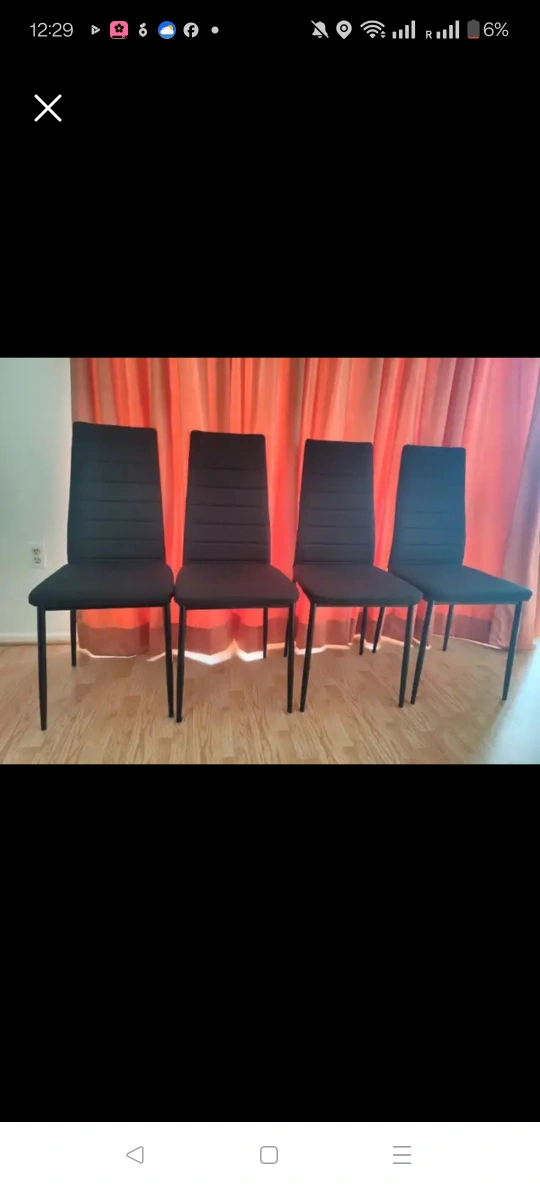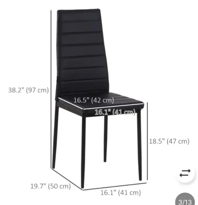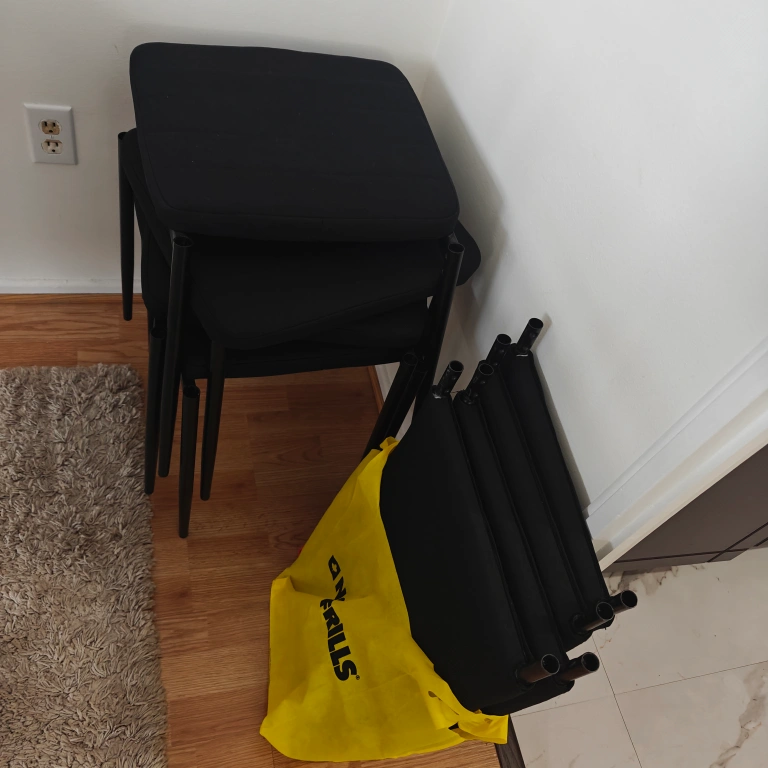 Four modern black dining chairs. Sleek design, metal legs. Suitable for kitchen or dining room.