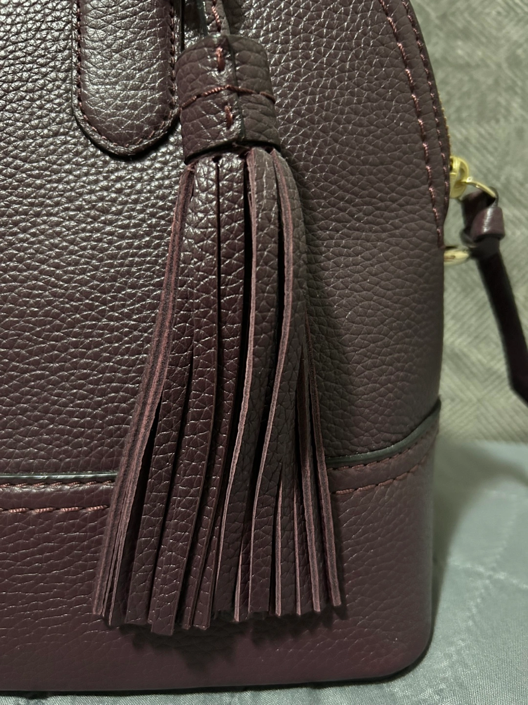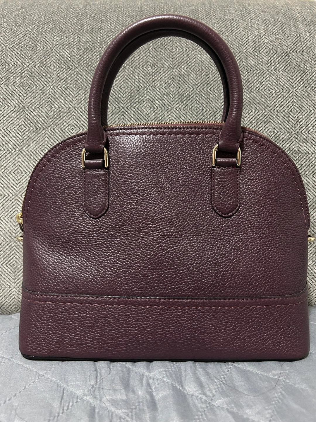 Beautiful burgundy leather satchel. Top handle and removable strap. Zip closure. Small size, perfect for everyday use. Includes a cute tassel detail.